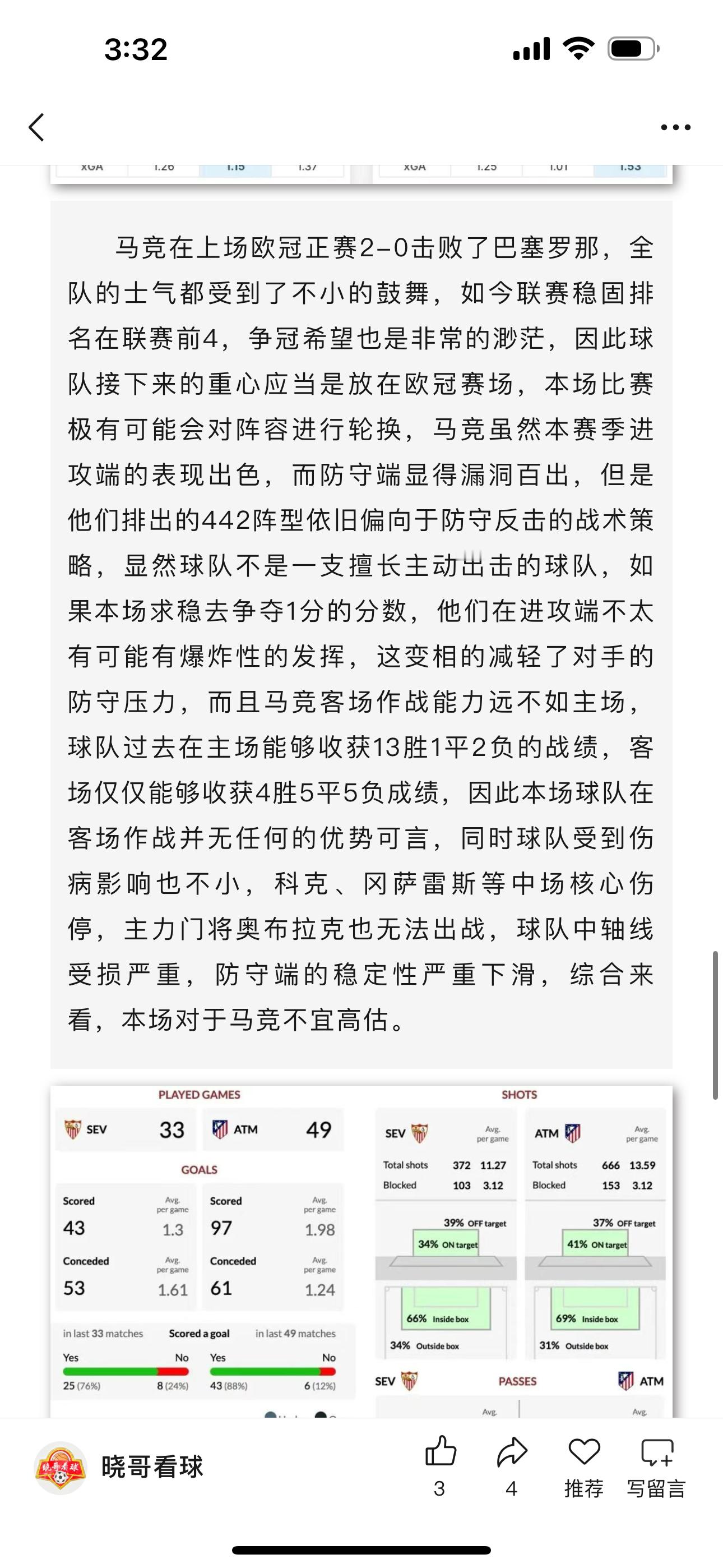 昨日公推塞维利亚方向成功收获好评,这场比赛马竞明显受到了此前欧战体能衰弱的影响,全场的控球率完全占据优势,但是未能转换成高效的进球,在终结方面做的相对差劲了一些,而塞维利亚本身就擅长进攻,这场比赛能够突破马竞防守攻入两球不会让人意外,赛前分析我就提到马竞本赛季的防守效率一般,起伏不定,这场好评合理。塞维利亚vs马竞足球预测体育赛事体彩