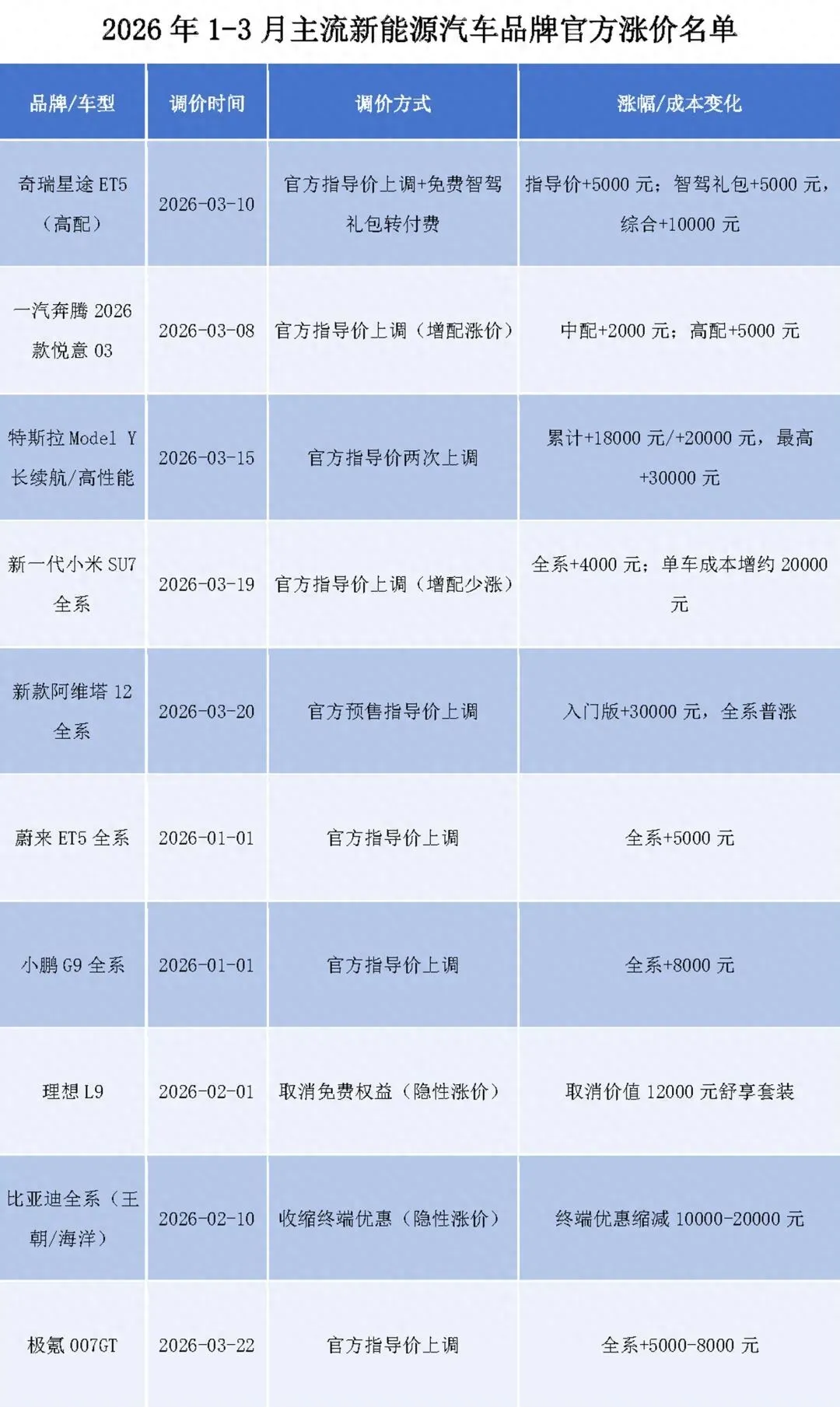 据不完全统计,已有超过15家新能源车企完成官方调价或发布涨价预告,涨幅集中在2000元至10000元之间,覆盖10万至30万元的主流家用市场,涨价车型占比超过六成。