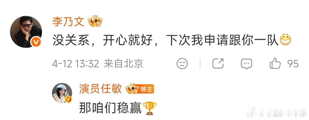 李乃文回复任敏任敏回复李乃文李乃文回复任敏 “没关系,开心就好,下次我申请跟你一队,”李乃文用一句话抚平所有情绪。任敏回复李乃文:“那咱们稳赢”,任敏的自信回应瞬间点燃斗志!一个温柔守护,一个全然信赖。这约定,比赢了比赛还让人开心!五哈
