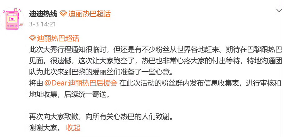迪丽热巴补偿去巴黎的粉丝去巴黎的粉丝收到了迪丽热巴的补偿细节见人品!迪丽热巴默默
