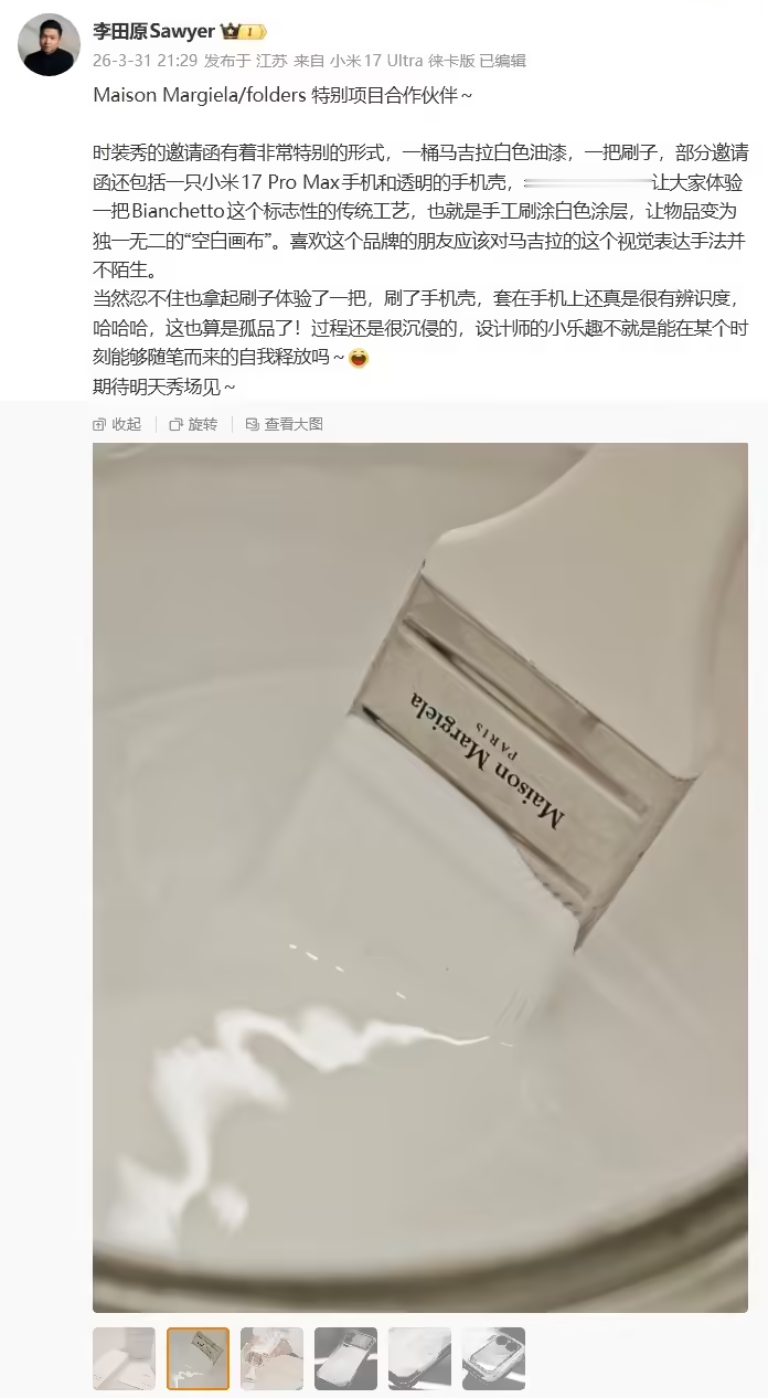 此前,小米汽车工业设计总经理、首席设计师李田原在今年3月底曾透露过小米和MaisonMargiela/folders的特别项目合作,并晒出了小米17ProMax的定制设计壳。