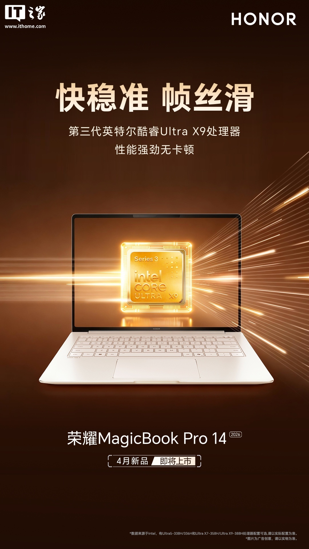 根据此前官方公布的信息,2026款MagicBookPro系列笔记本会搭载第三代英特尔酷睿Ultra处理器,可选型号包括Ultra5338H、UltraX7358H、UltraX9388H,性能释放最高可达88W。