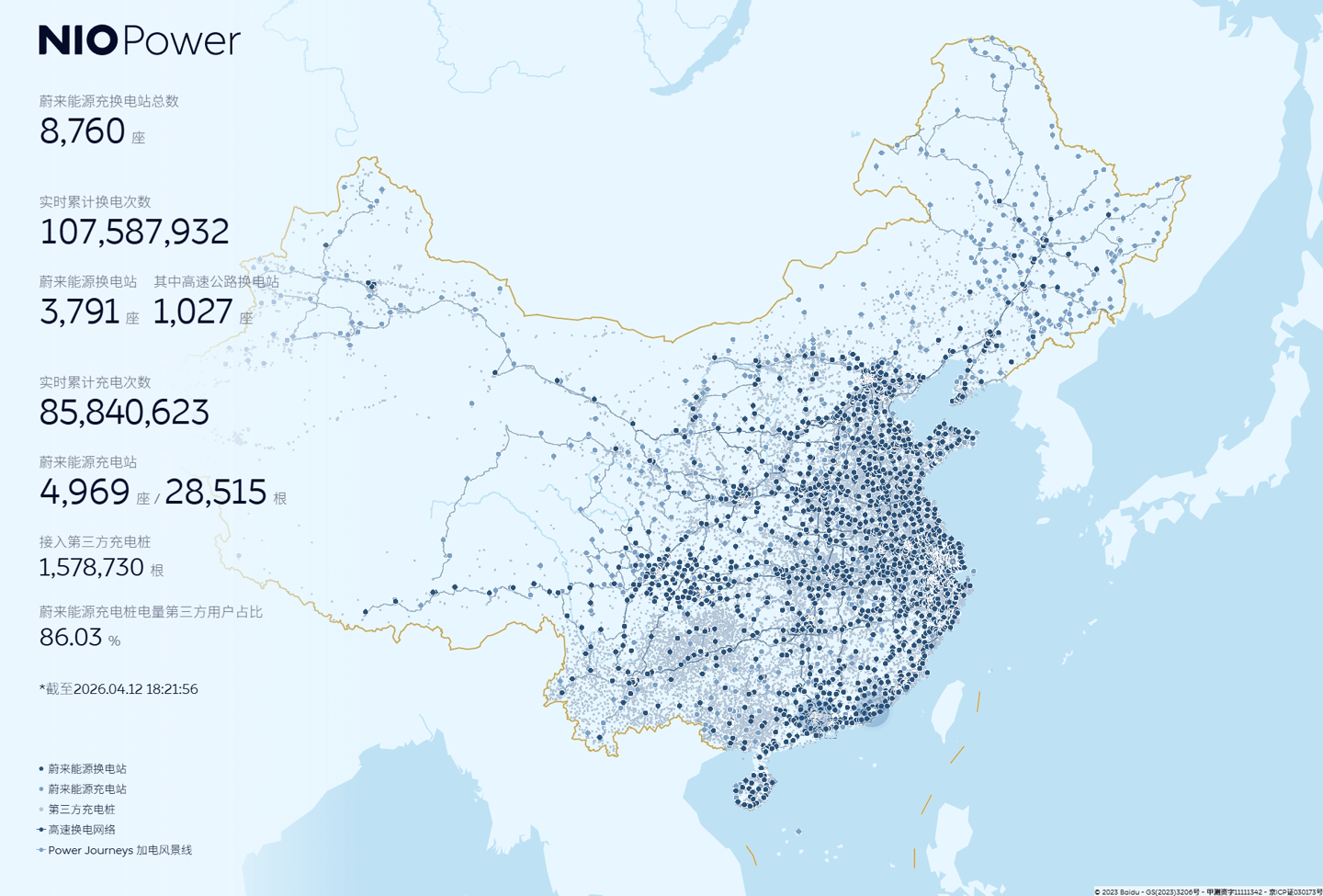 目前,蔚来能源充换电站总数已达到8760座:蔚来能源换电站3791座,其中高速公路换电站1027座;蔚来能源充电站4969座,接入第三方充电桩1578730根。
