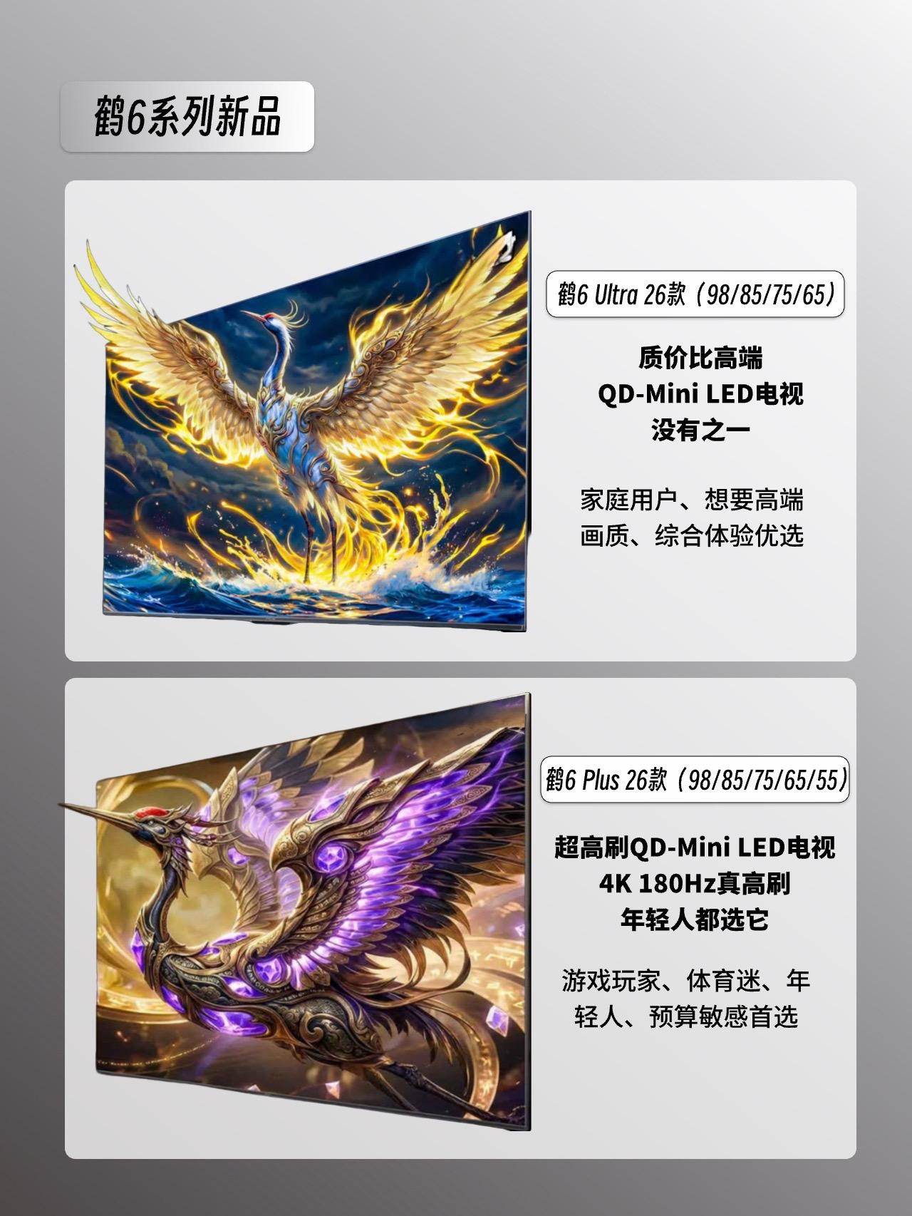 3️⃣雷鸟鹤6 Plus 26款:超高刷QD-Mini LED电视,4K 180Hz真高刷,游戏玩家、年轻人首选