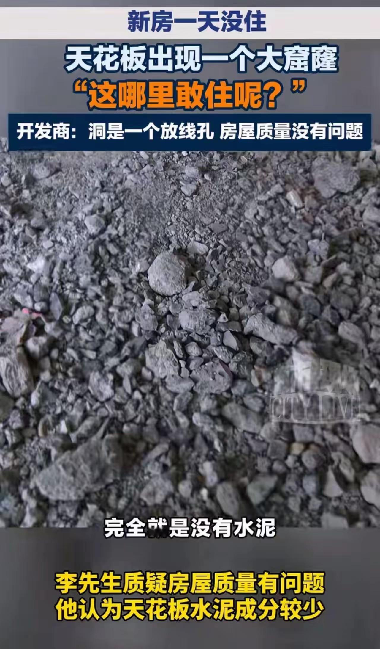 “拿生命安全当儿戏!”江西南昌,新房一天没住,天花板出现一个大窟窿,男子哭诉:“这我哪里敢住?完全没有水泥!”开发商神回复:“洞是一个放线孔,房屋质量没有问题 !”网友:事实摆在面前,还敢这样说话,了不起!