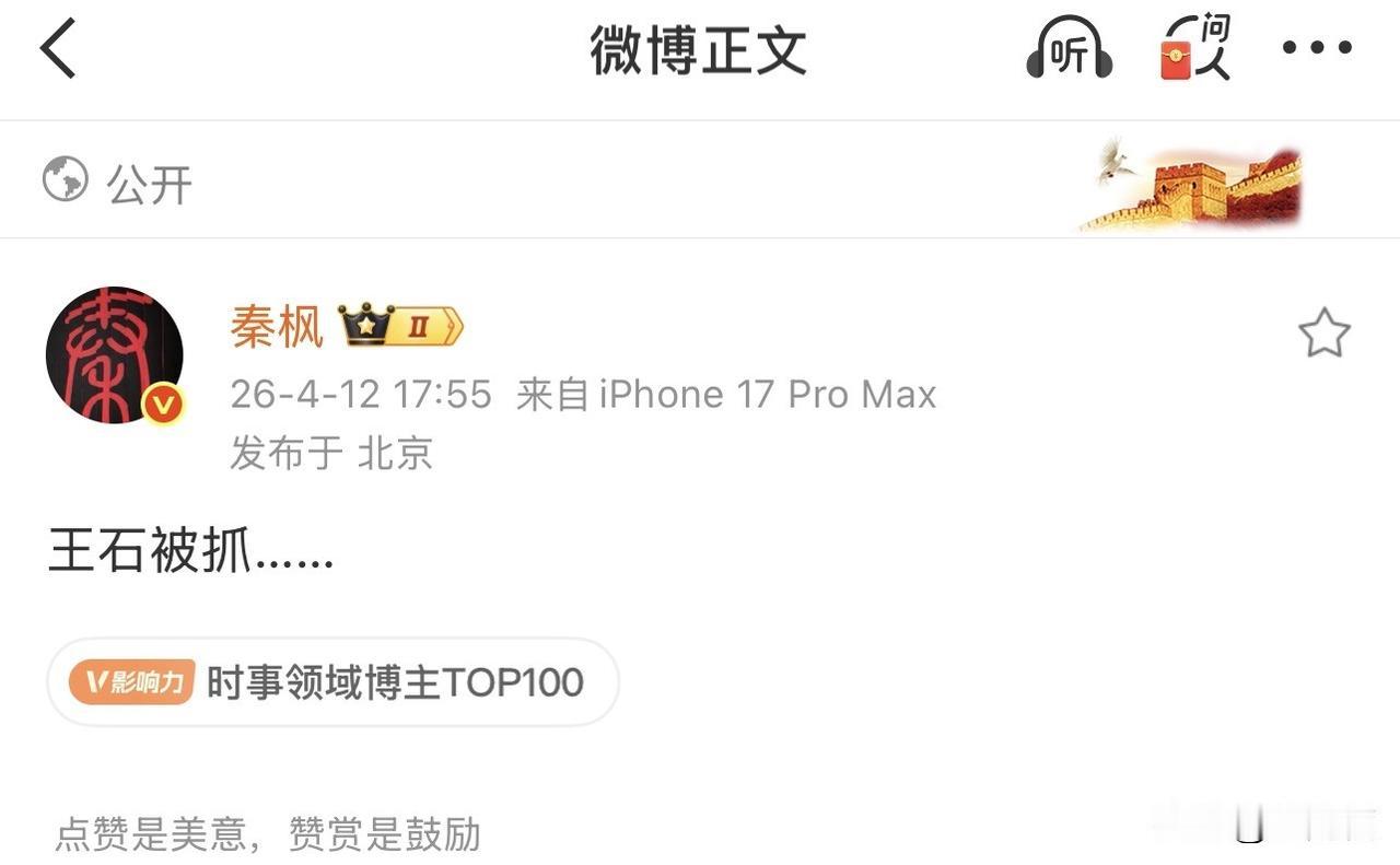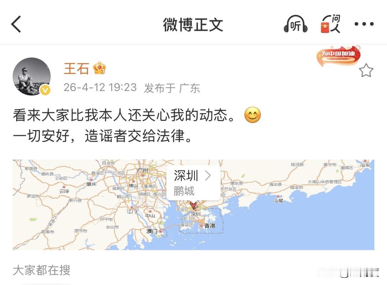 王石田朴珺先后回应“王石被抓”传闻:这是法治社会,造谣是不需要付出代价的吗? 造谣者交给法律。