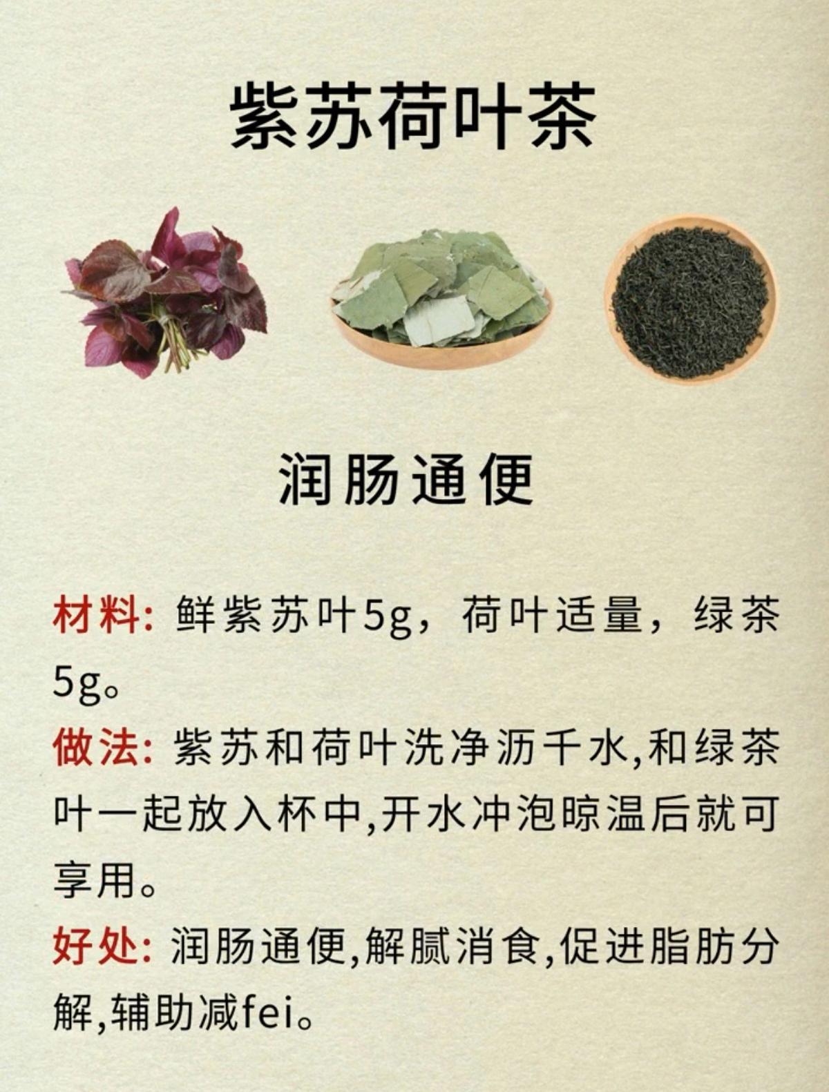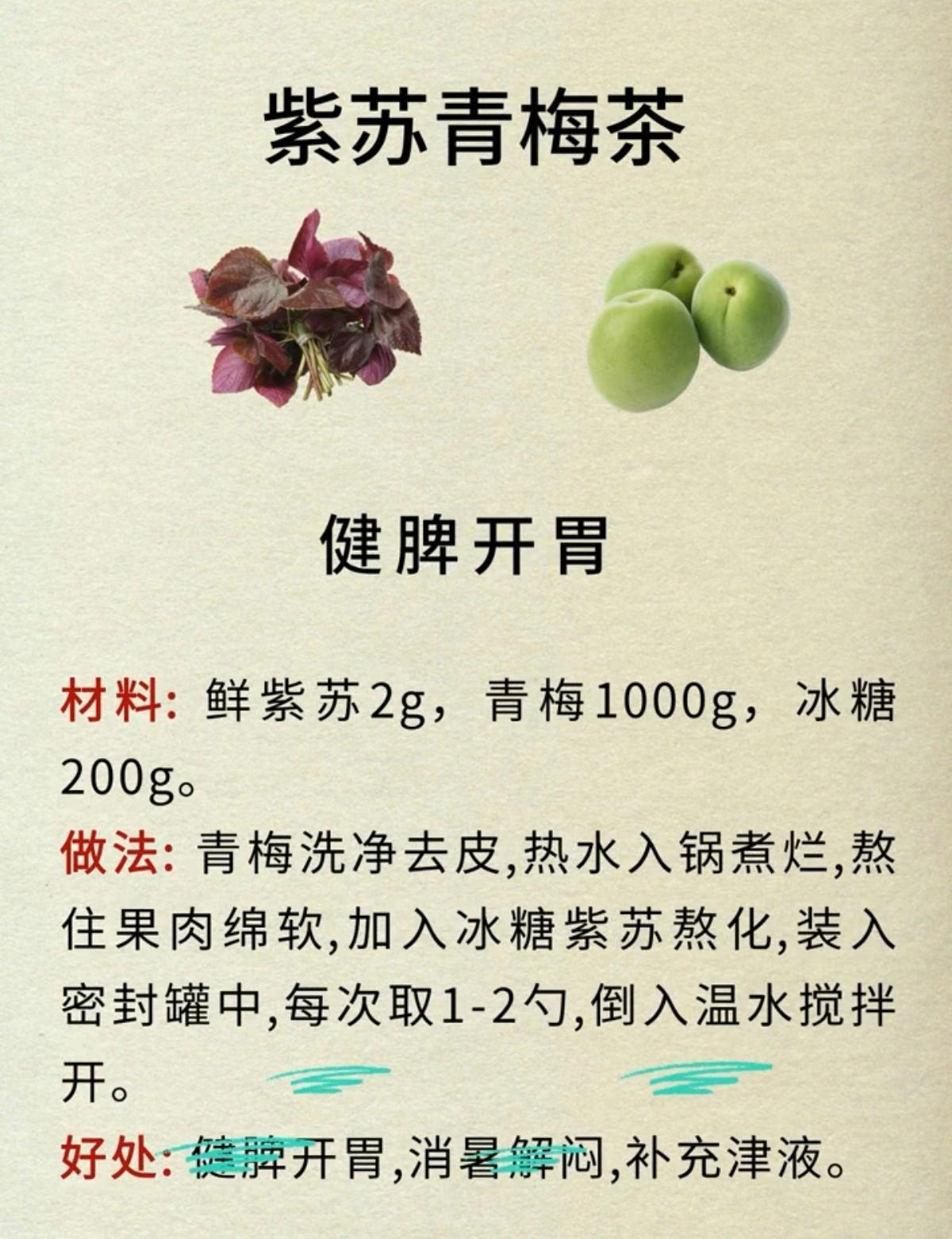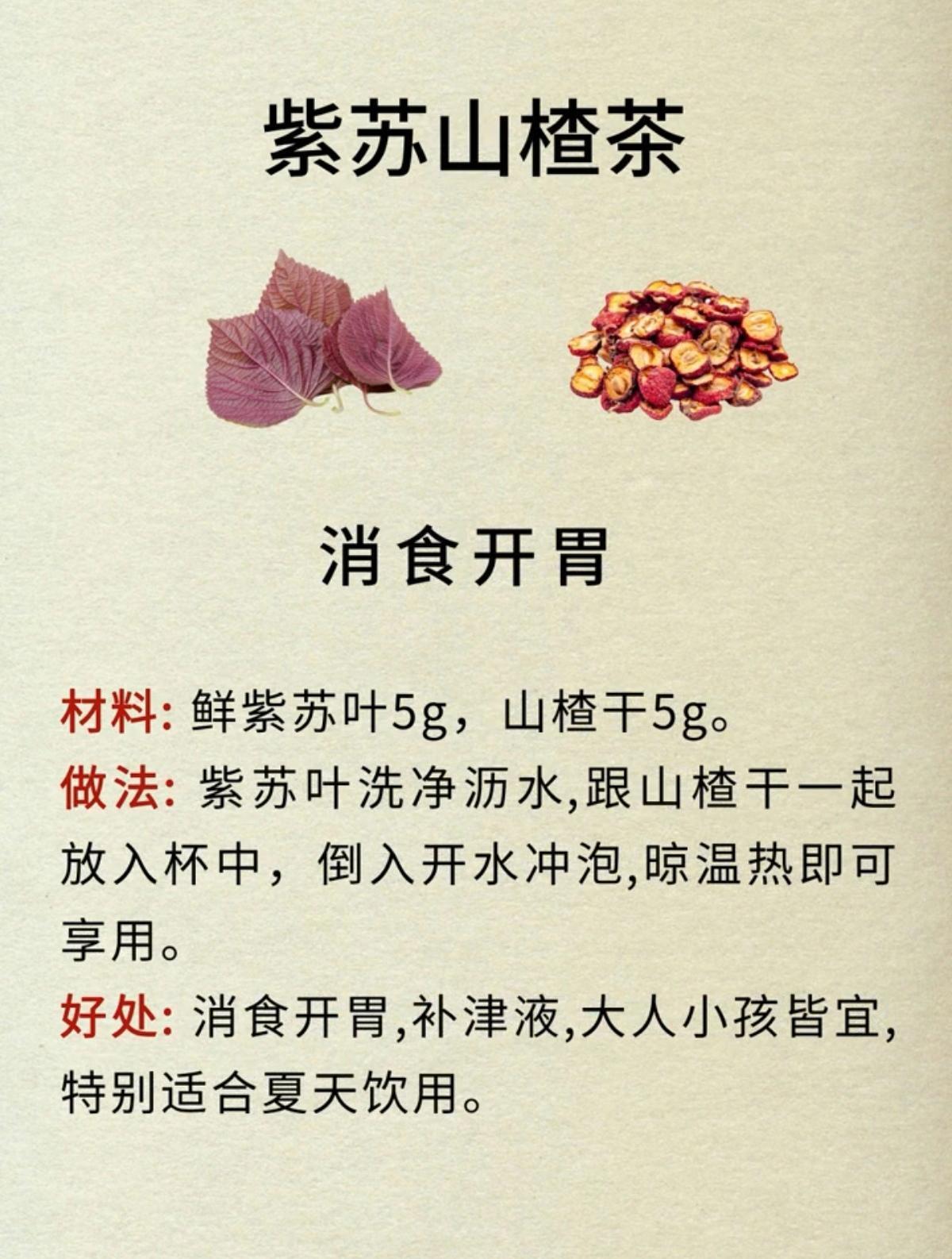 紫苏乌梅茶,生津解渴,清热解毒;紫苏姜糖茶,不伤脾胃,生养小甜水;紫苏菊花茶,清热解毒,提神醒脑;紫苏山楂茶,消食开胃,补津液;紫苏荷叶茶,润肠通便,解腻消食;紫苏青梅茶,健脾开胃,解暑消闷;紫苏陈皮茶,消化不良,肚子胀,寒湿重;