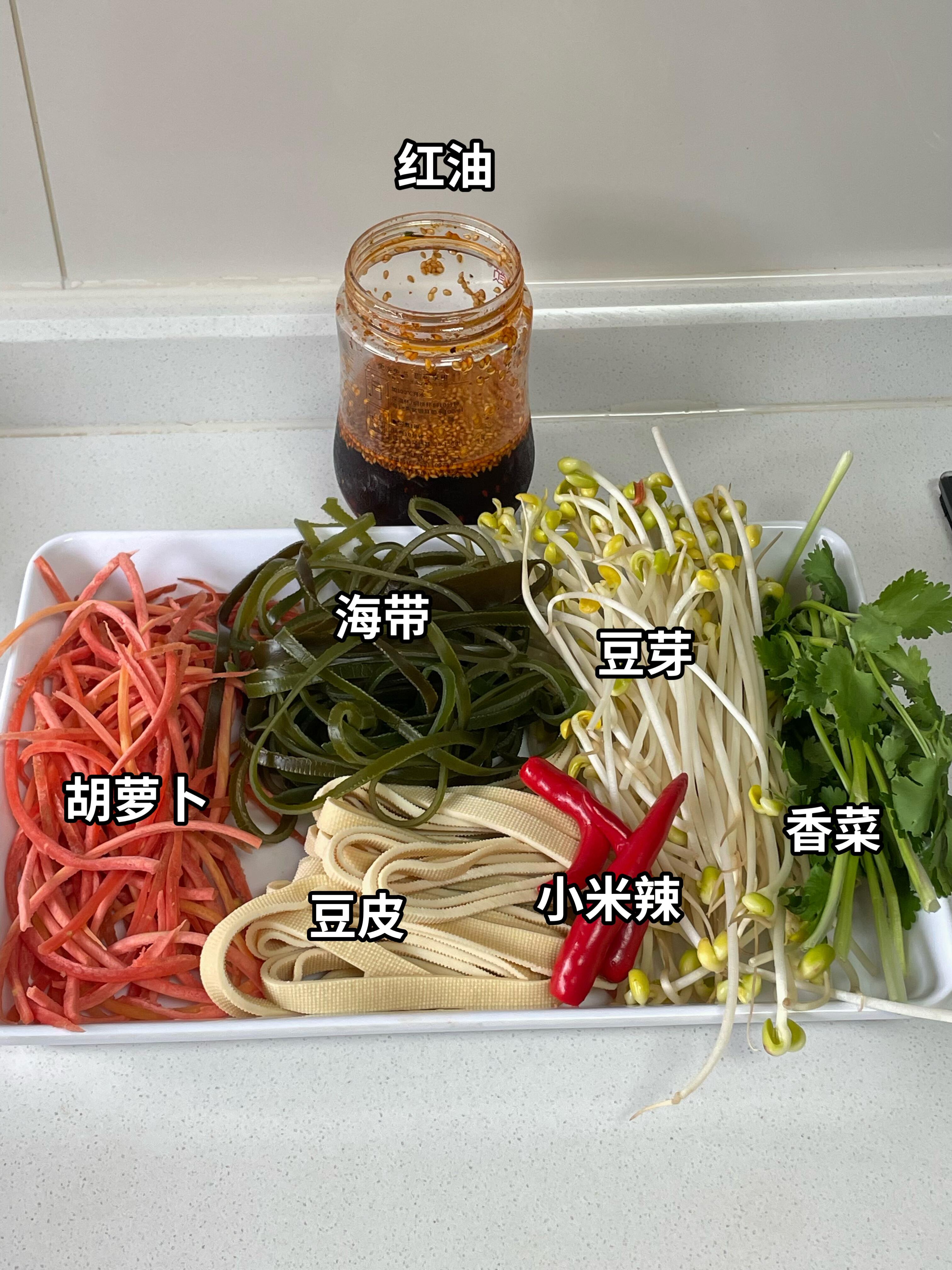 1️⃣ 锅中加水烧开,把洗干净的豆芽、海带、胡萝卜、豆皮依次放入锅中烫熟,烫好后立即捞出,充分控干水分备用(避免出水影响口感)。