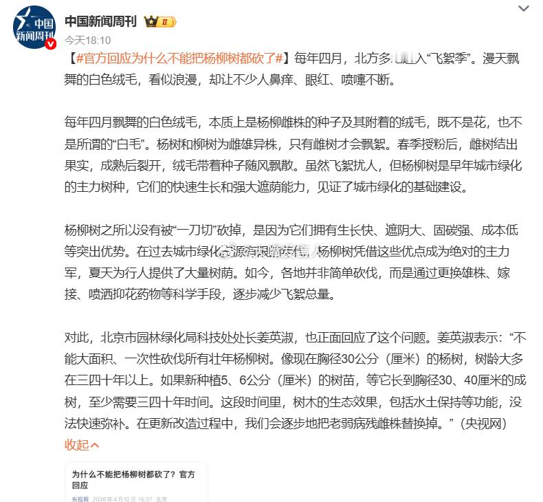 官方回应为什么不能把杨柳树都砍了 这边也是,春季里很多路边的树木“掉毛”对我