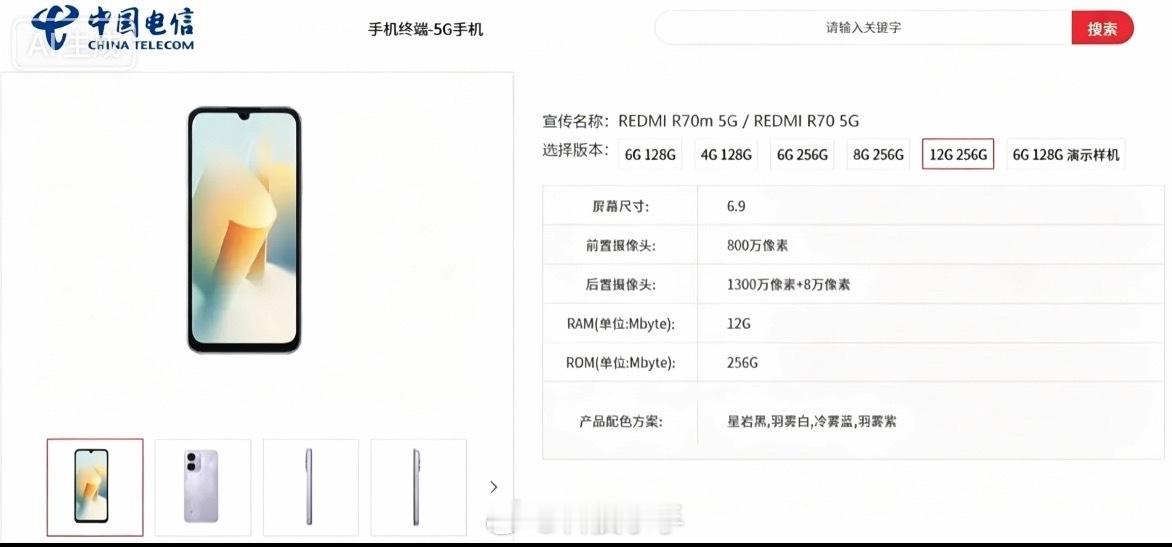 刚看到REDMI R70m/R70 5G手机出现在产品库里了,配置给大家简单说一下,屏幕是6.9英寸水滴屏,直角边框设计,底部有扬声器孔,还有3.5mm耳机接口和Type‑C接口,接口算是给全了。电池是6300mAh,续航应该挺顶。有4+128、6+128、6+256、8+256、12+256 五种版本可选,颜色有星岩黑、羽雾白、冷雾蓝、羽雾紫四种。系统是Android 16,AP型号是UMS9632,目前价格还没公布。属于参数看得很清楚、等着定价的阶段。数码资讯