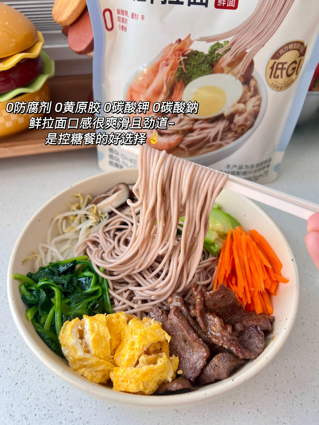 我用的是DGI家的荞麦鲜拉面!!荞麦面容易口感粗糙或者味道奇怪,还有的是加了小麦粉的“假低GI”