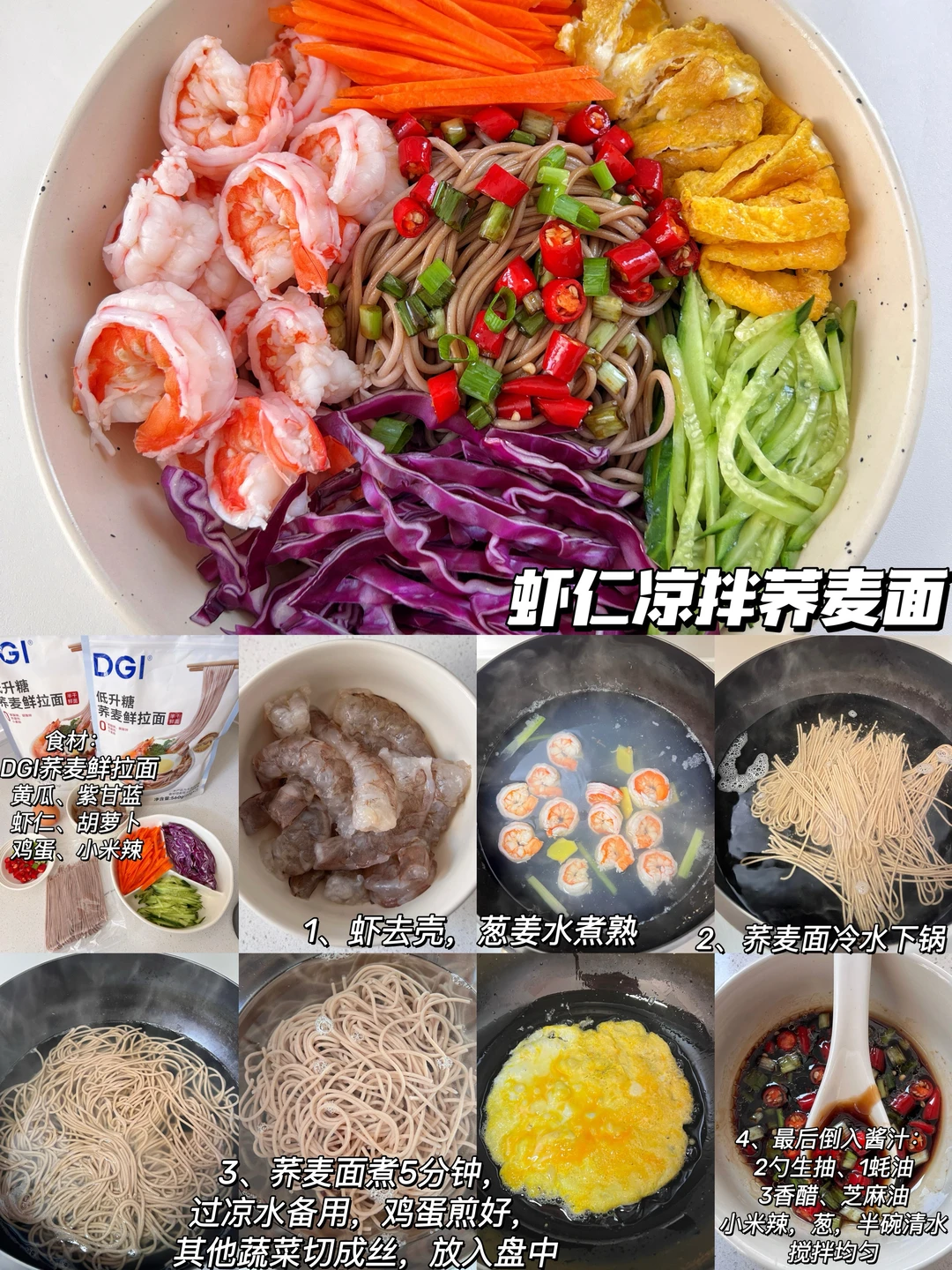食材:DGI荞麦鲜拉面、虾仁、时蔬、鸡蛋、辣椒