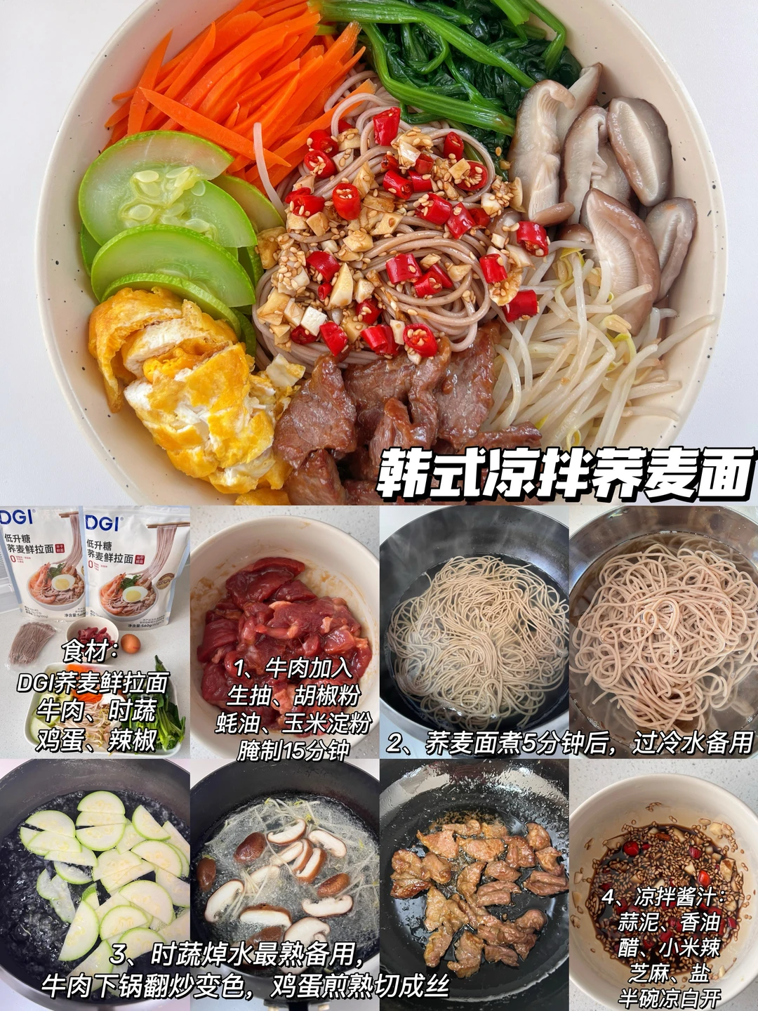食材:DGI荞麦鲜拉面、鸡胸肉、鸡蛋、黄瓜、胡萝卜、豆芽辣椒