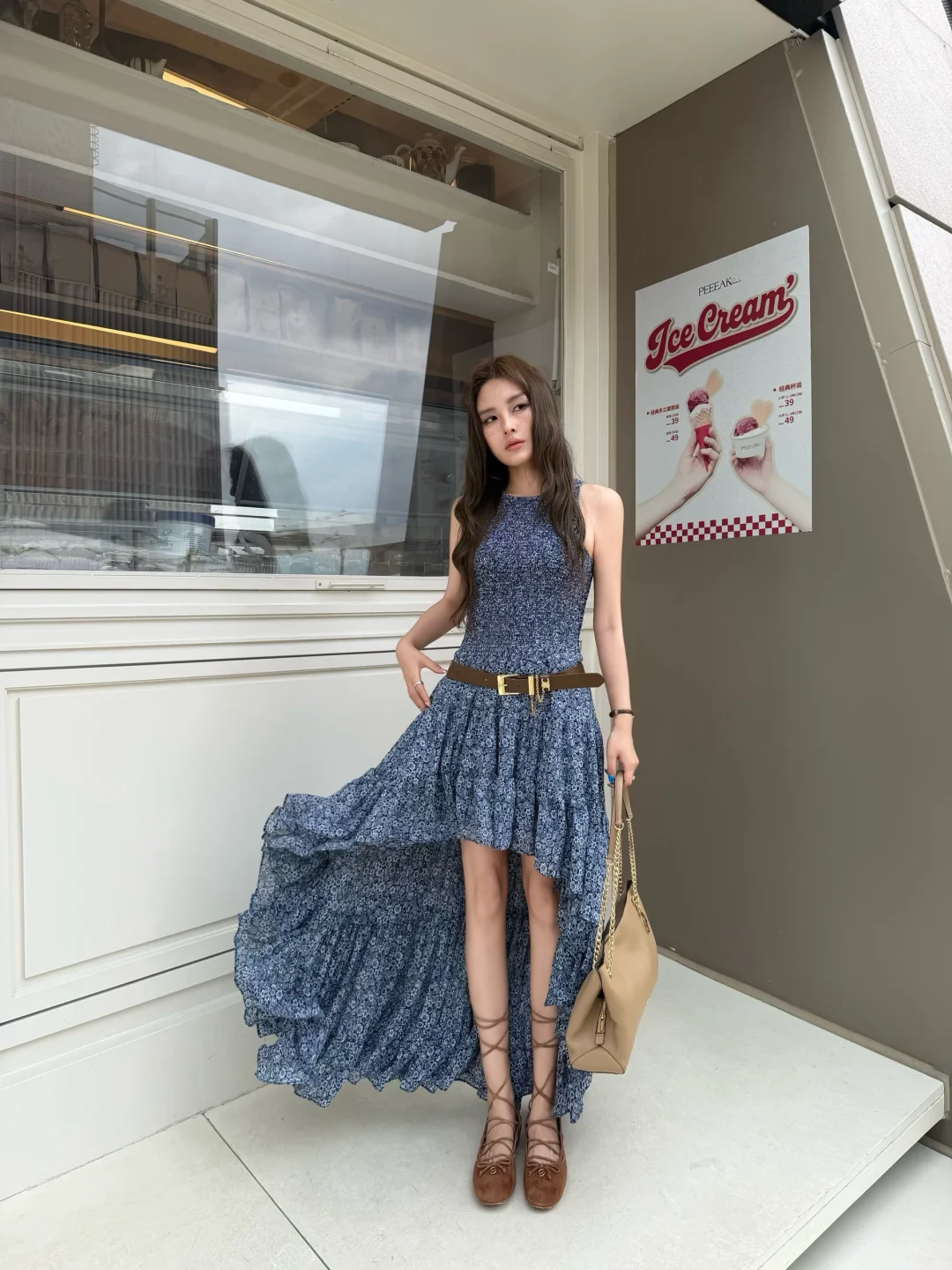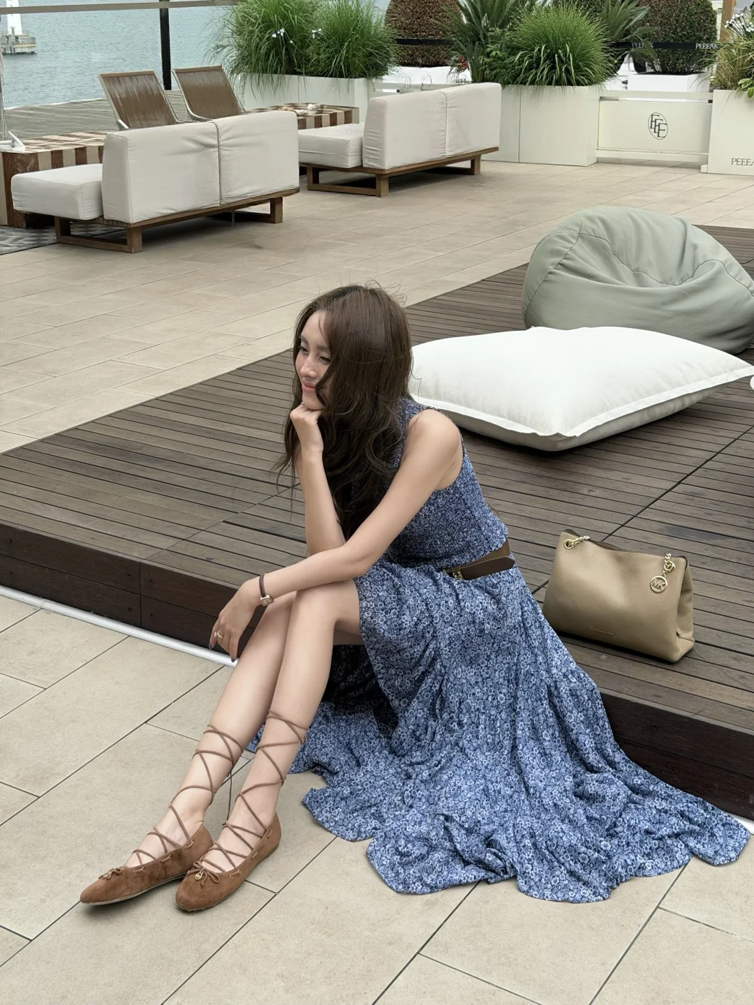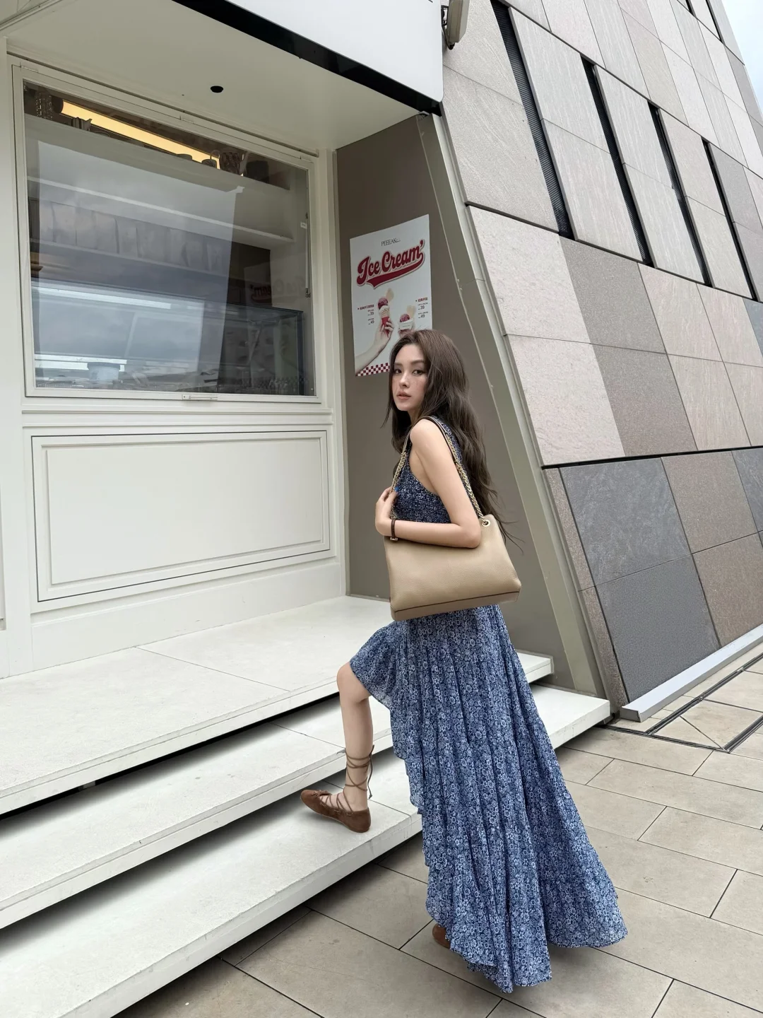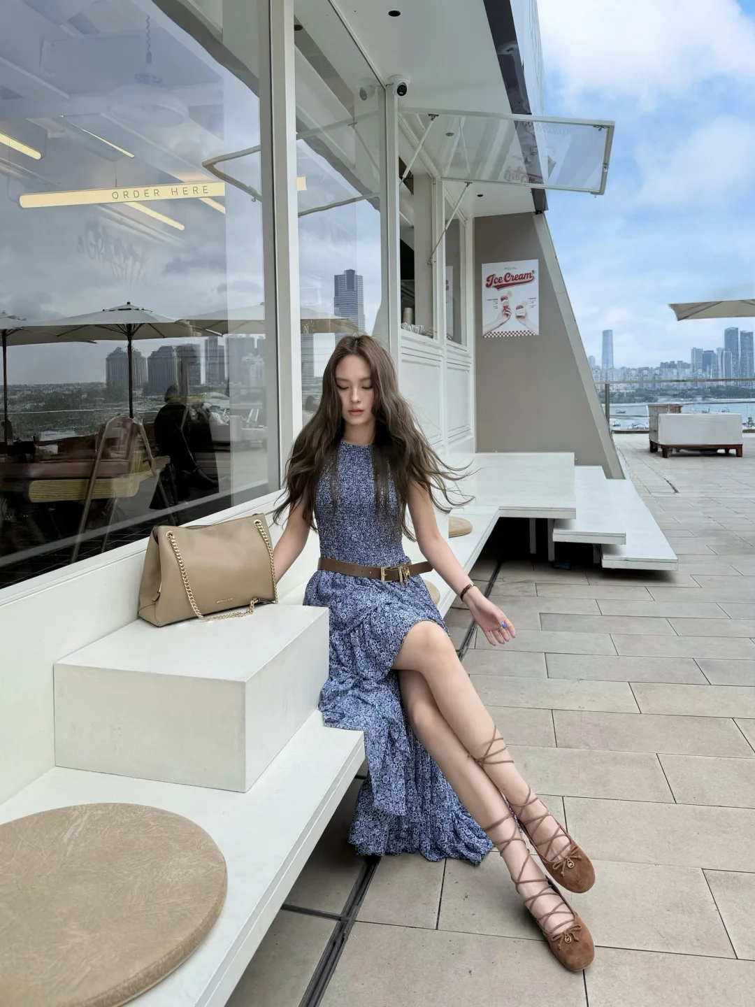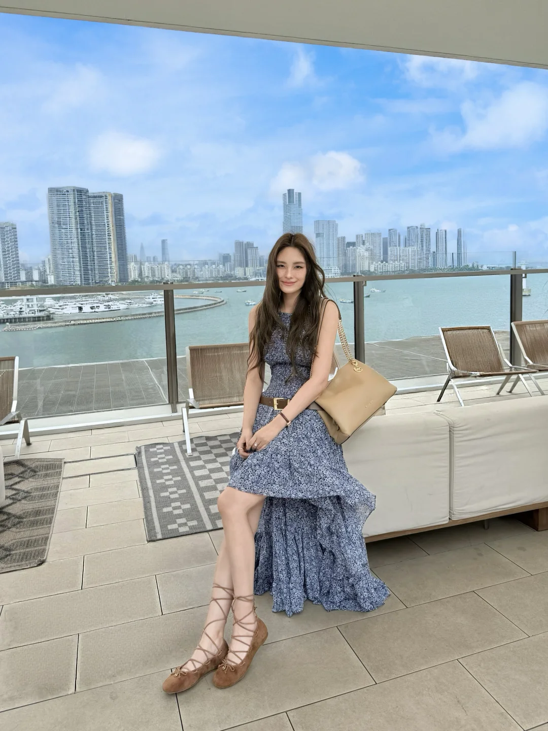 都市时尚女孩,黑色背心搭配牛仔裤,手拿粉色包包,享受夏日饮品。穿搭街拍