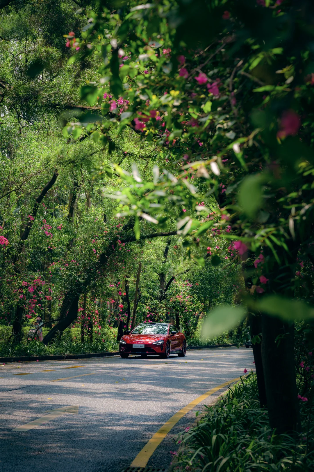 有人问春天是什么颜色?在香山中街,春天是三角梅的粉紫,是新叶的翠绿,也是新SU7身上那一抹从容流动的赤霞红。