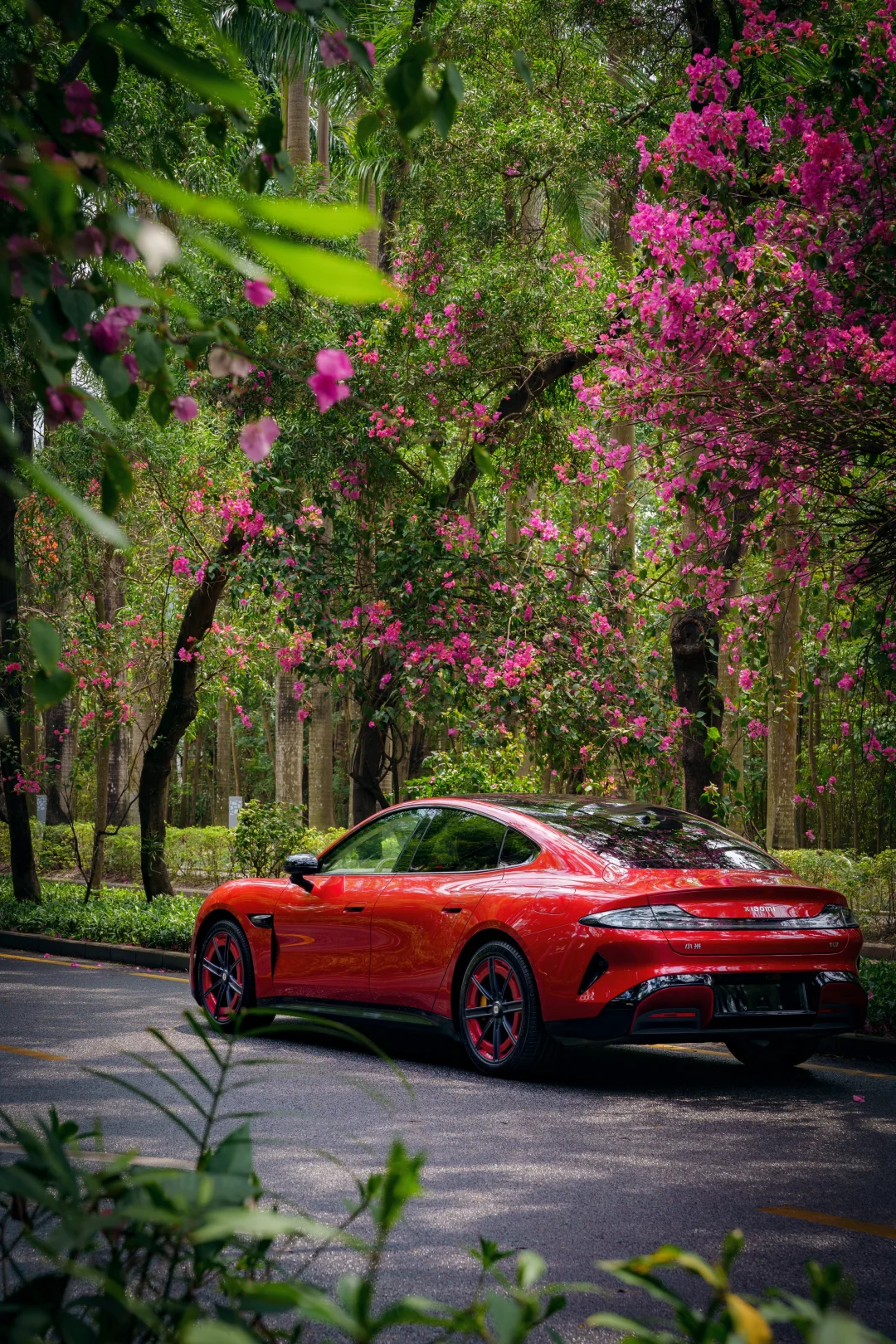 当新SU7优雅的驶进这片花海,车身在阳光下泛出细腻的光泽,那抹赤霞红在粉紫色花丛中既不抢戏,又足够醒目。流畅的车身线条,与恣意生长的花枝相映成趣。