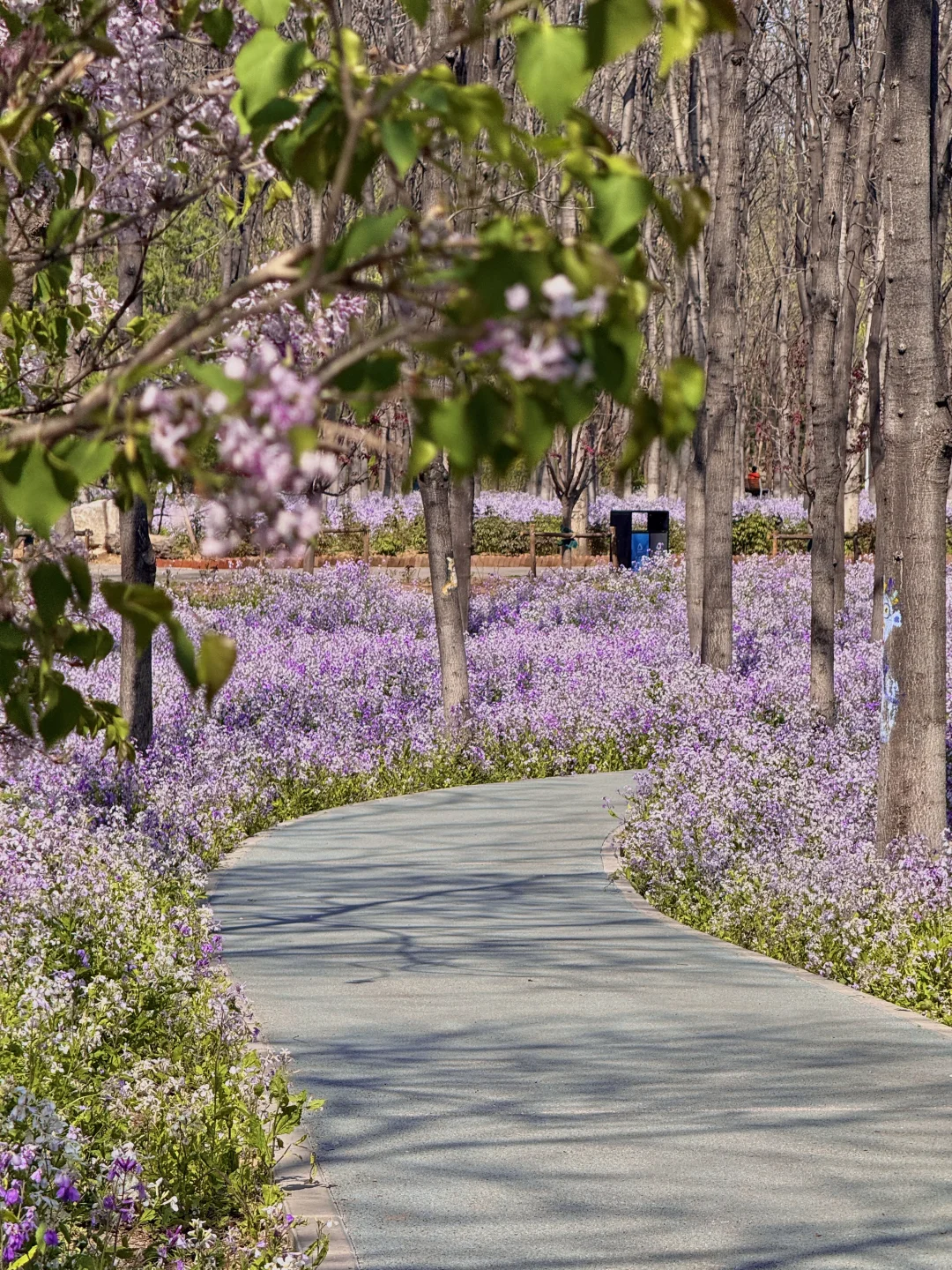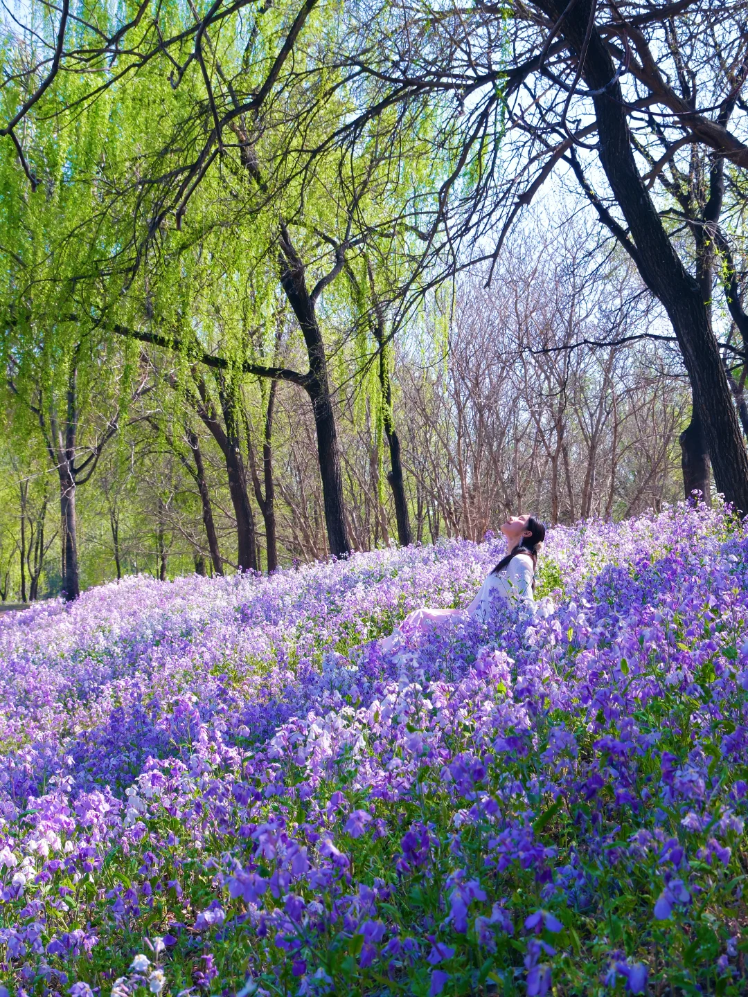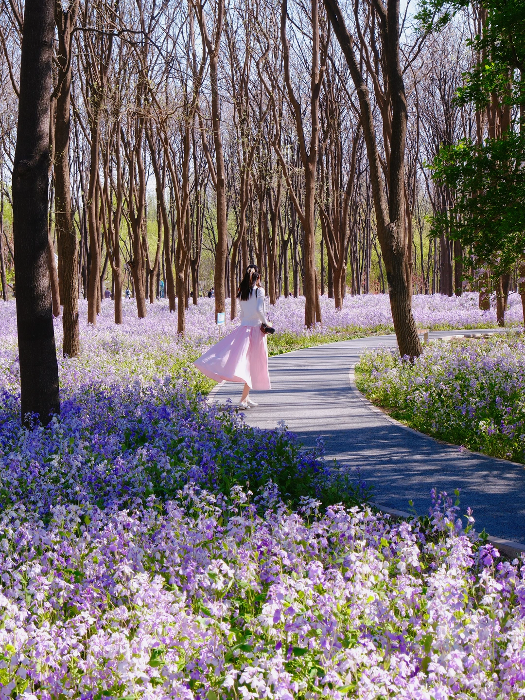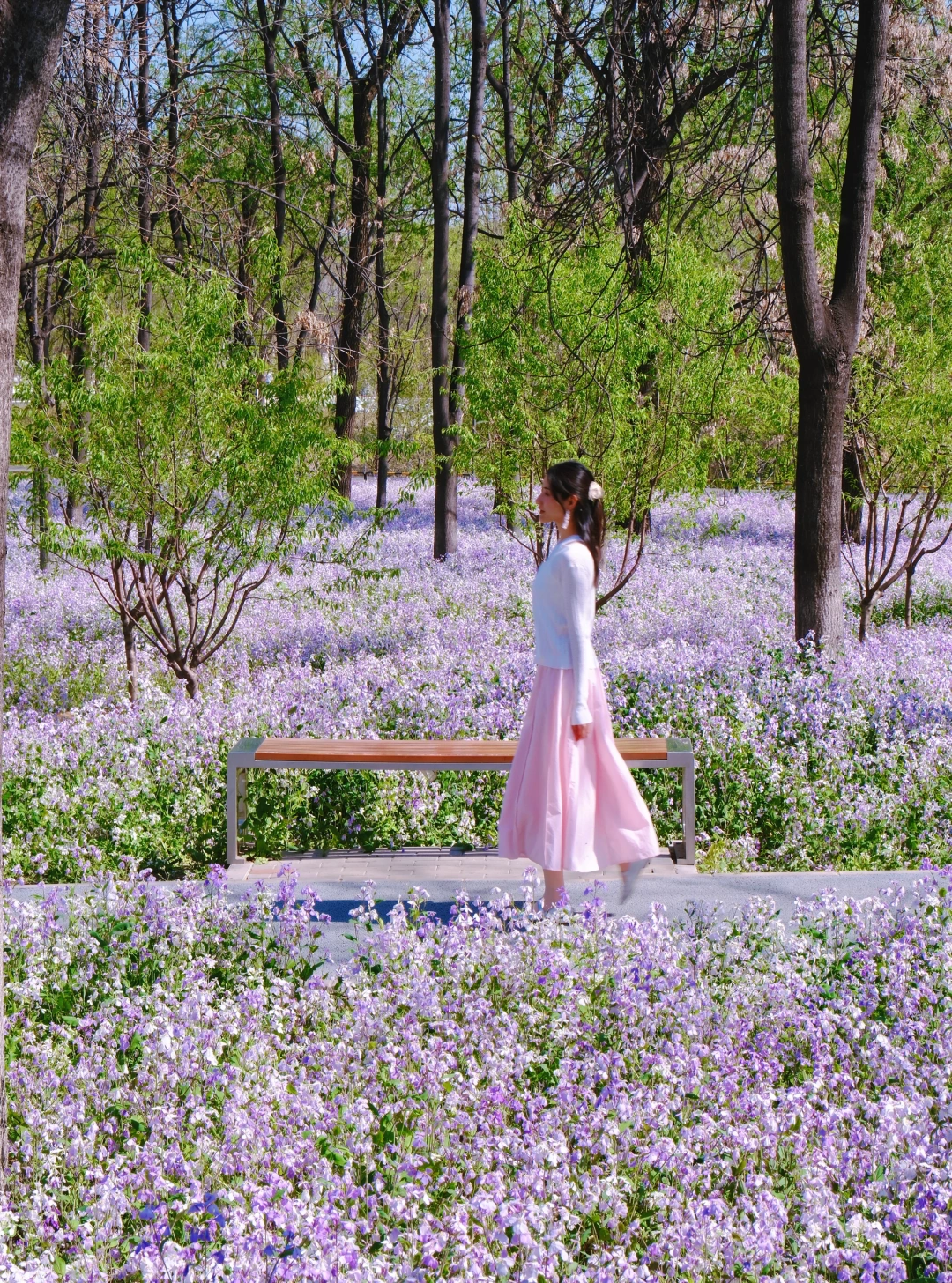 2️⃣花海长椅:以二月兰为拍摄前景,坐在长椅上慵懒回头,温柔感直接拉满,随手拍都是大片