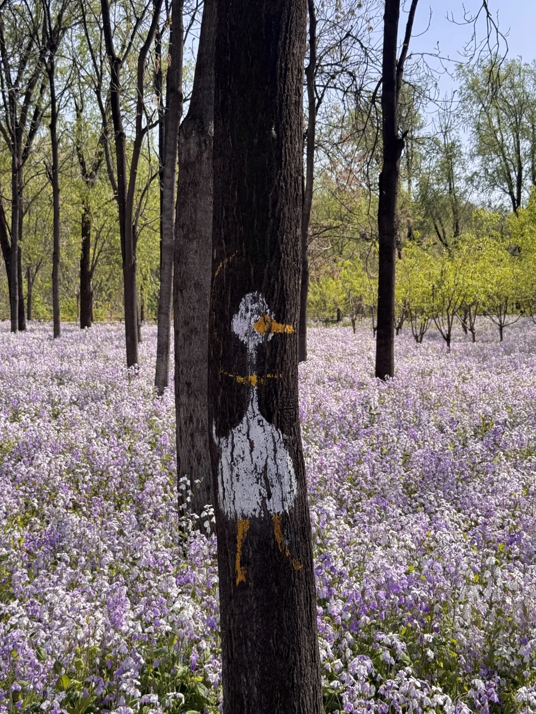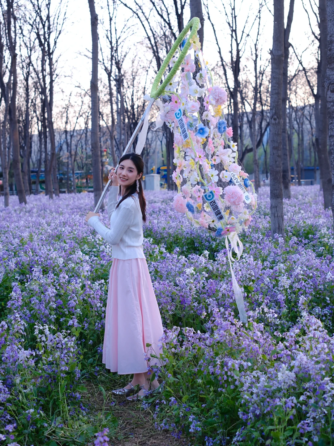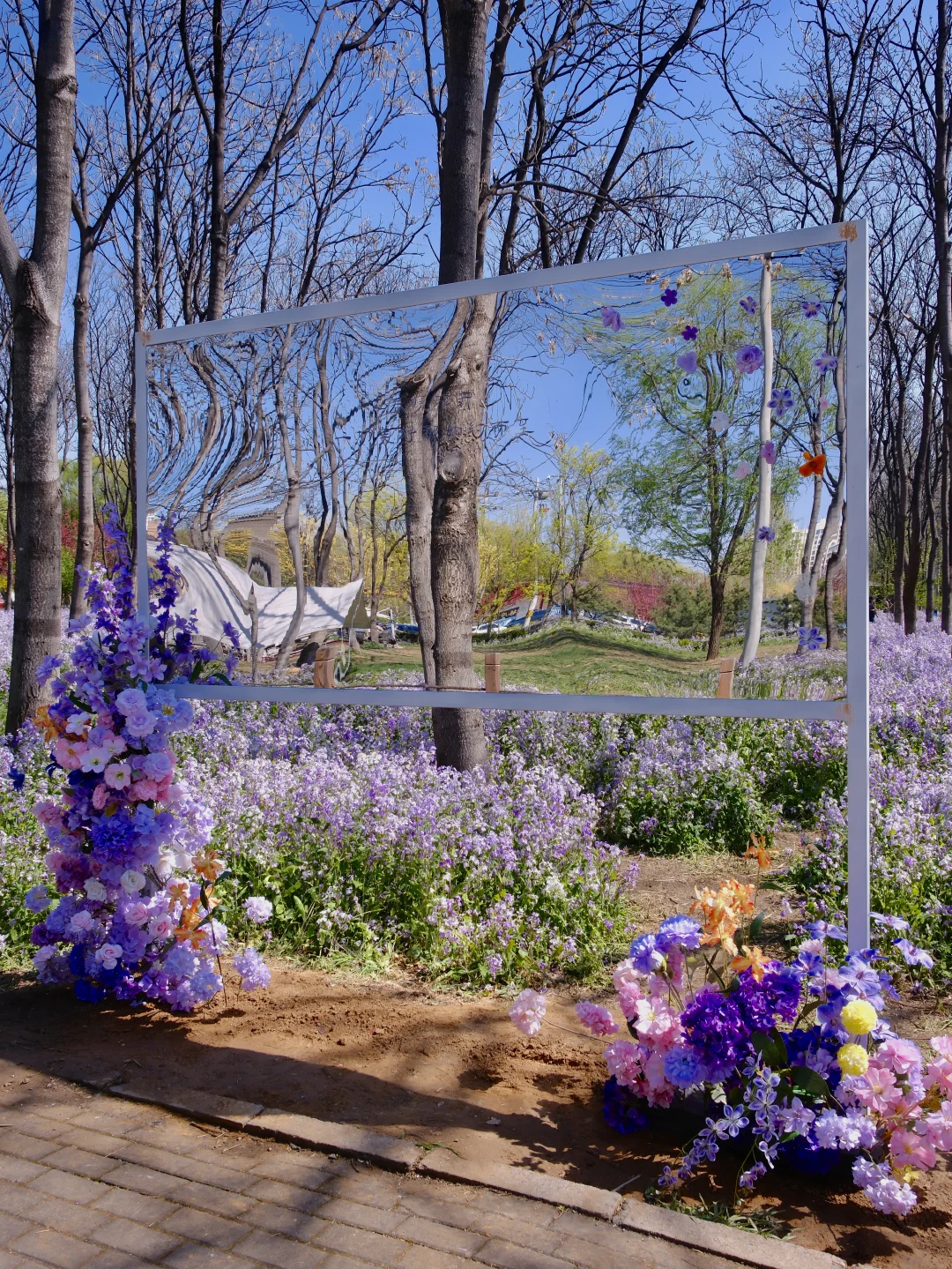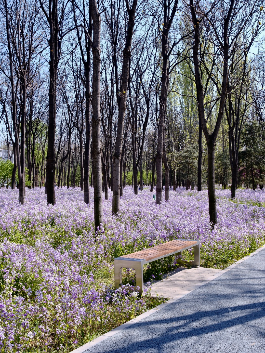 2️⃣花海长椅:以二月兰为拍摄前景,坐在长椅上慵懒回头,温柔感直接拉满,随手拍都是大片