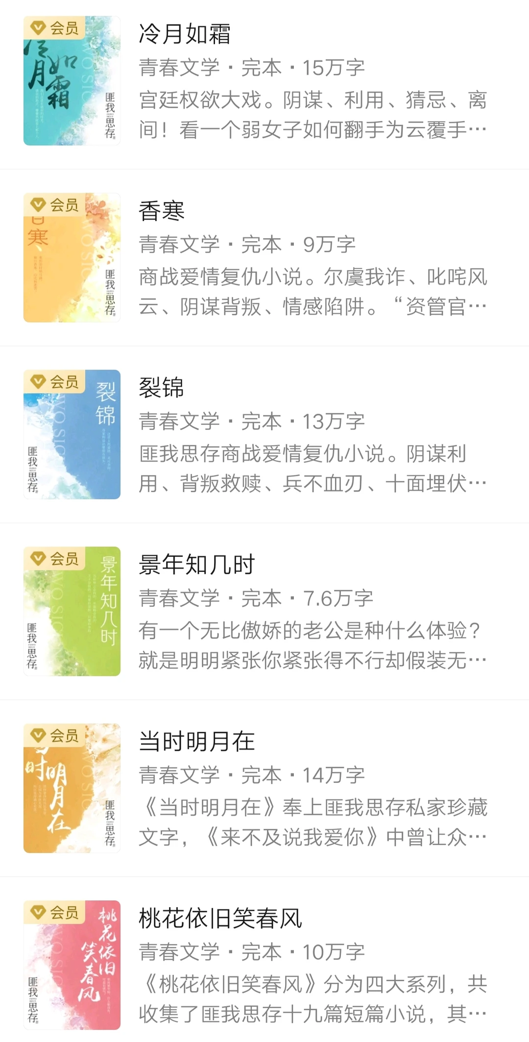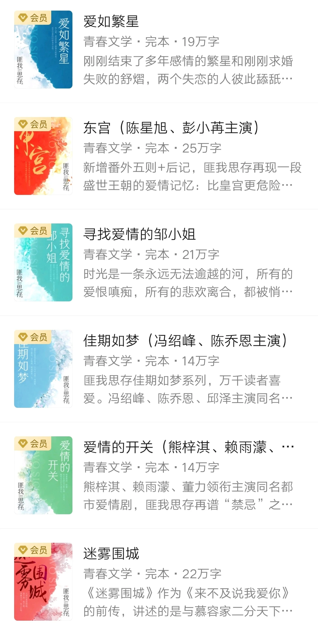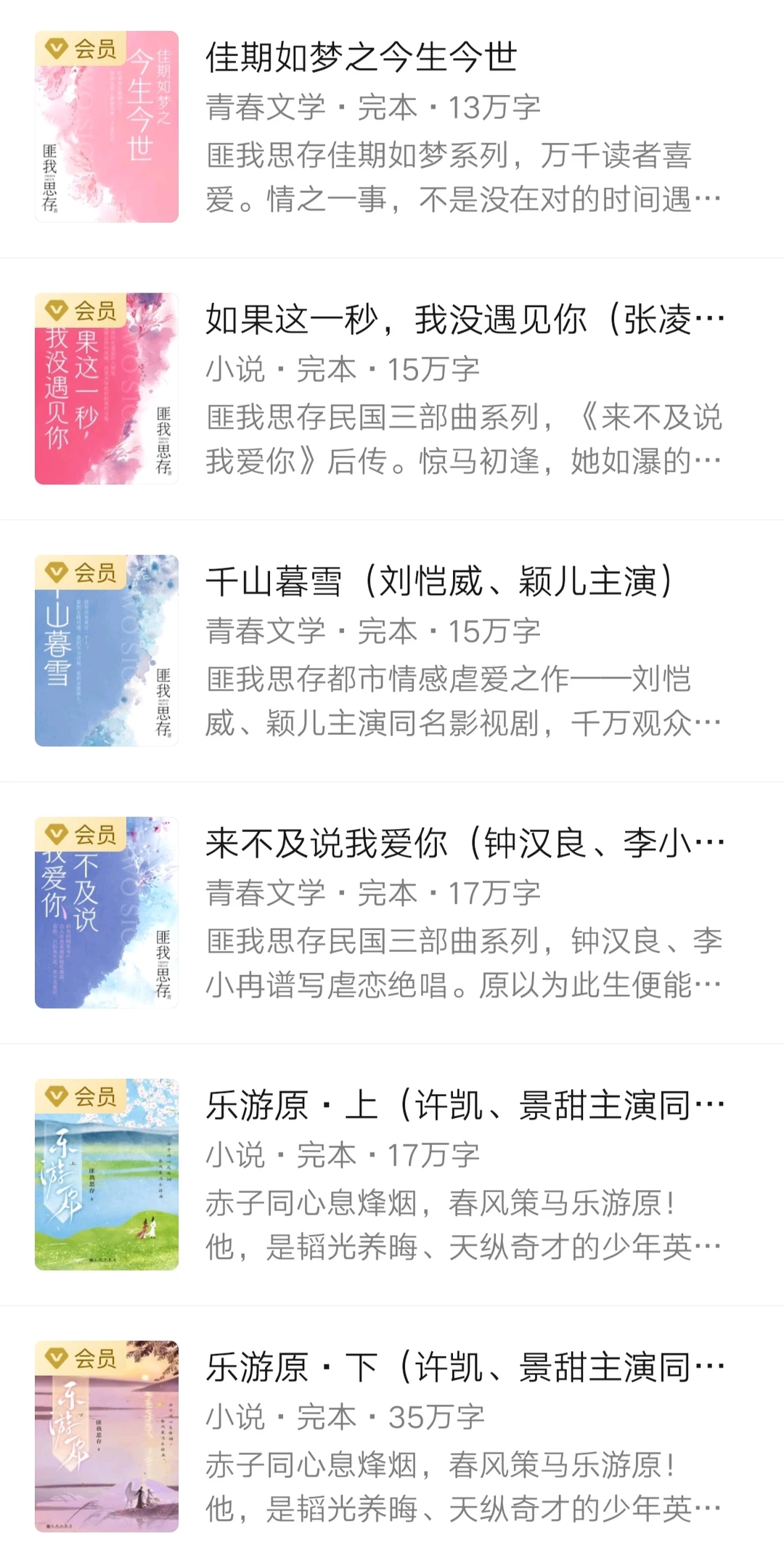 因为来不及说我爱你这本书,去看了电视剧,虐身虐心之后还不放弃,又去翻匪我思存的书单,除了两三本没看,她的书单列表几乎全读了一遍。