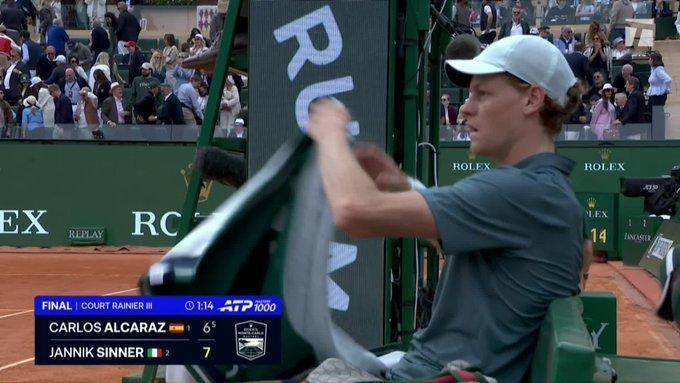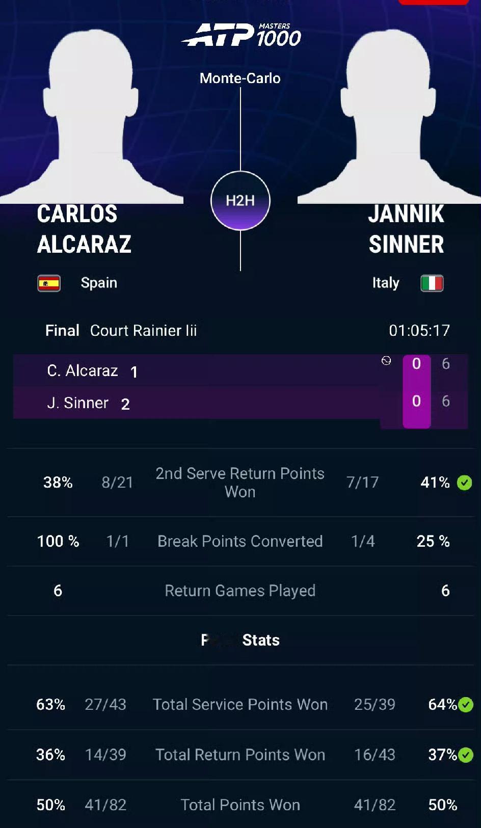 双子星对决过于精彩,首盘就打了74分钟,抢七前两个人得分都是41分,就是这么势均力敌。 最终辛纳只多拿了两分,再次实力演绎什么叫“毫厘之差”。辛纳抢七7-5拿下首盘。 两人大概率要鏖战三盘,打到凌晨也不为过。
