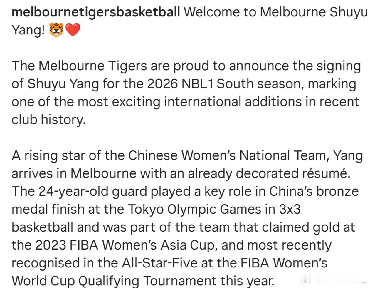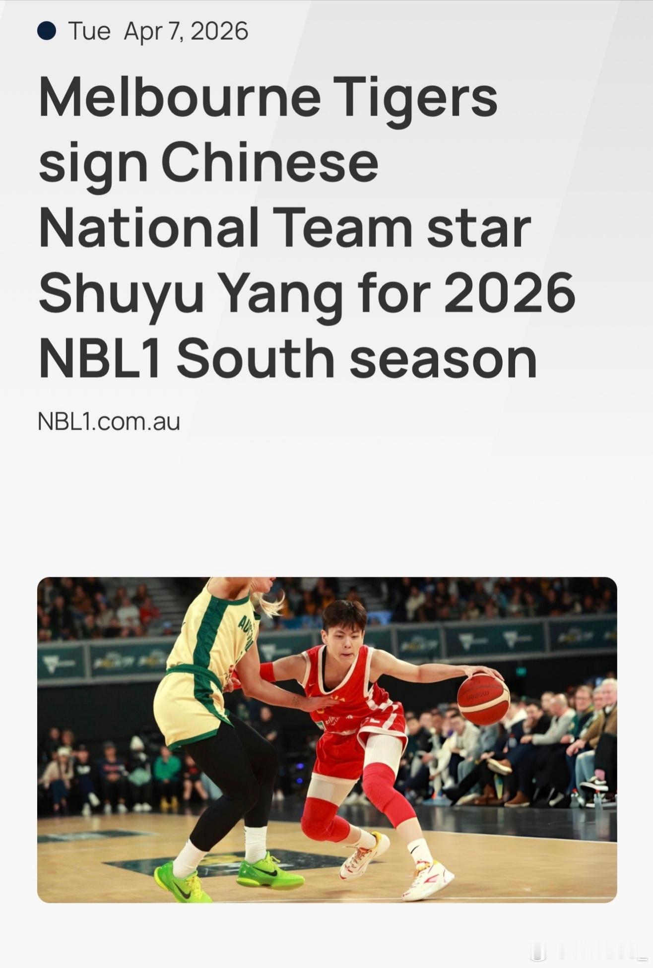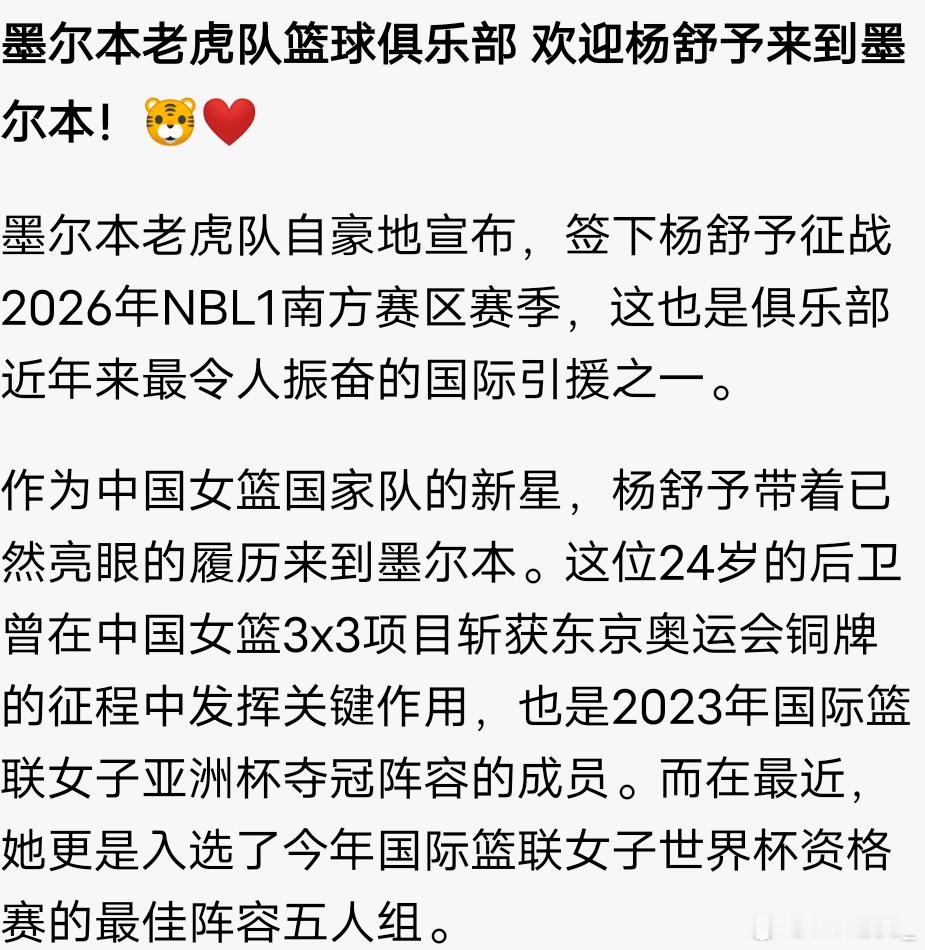 杨舒予杨舒予杨舒予加盟墨尔本老虎队 20260407小羊加盟澳洲NBL1墨尔本老