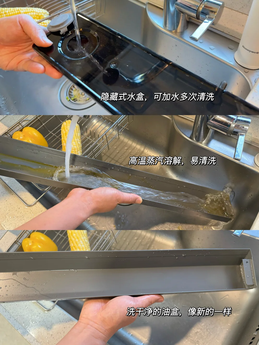 而且作为有娃家庭,真的超怕厨房清洁麻烦,这款可以自动识别污渍给自己洗澡,我只需要给它的的内置的水杯加加水,等它洗完直接倒掉脏水就行!