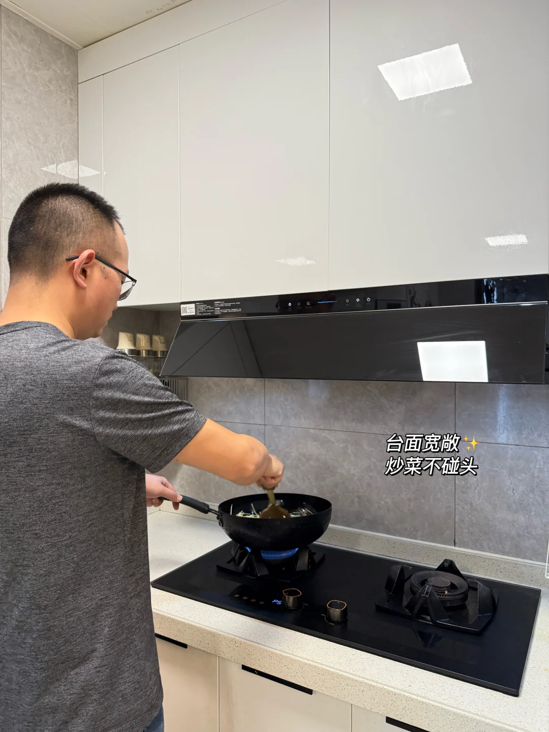 当初选它就是看中了顶侧一体的设计,350mm深度刚好和我家吊柜齐平,做饭再也不用担心碰头,橱下空间直接空出来,3层蒸锅随便放,颠勺更是不在话下!