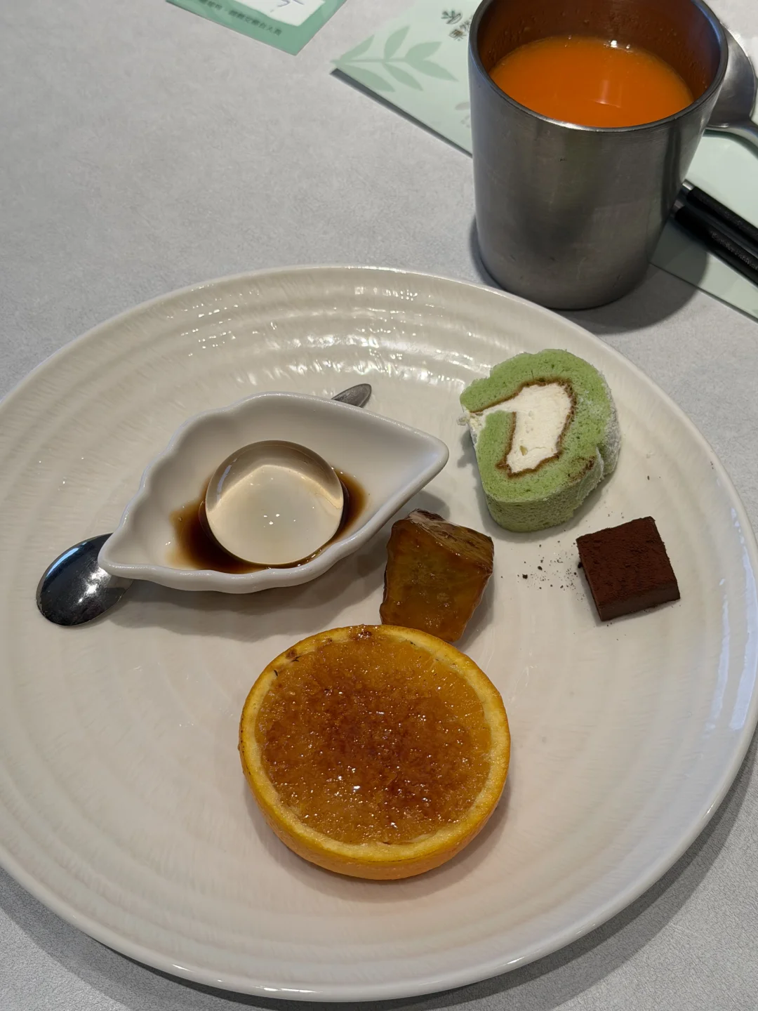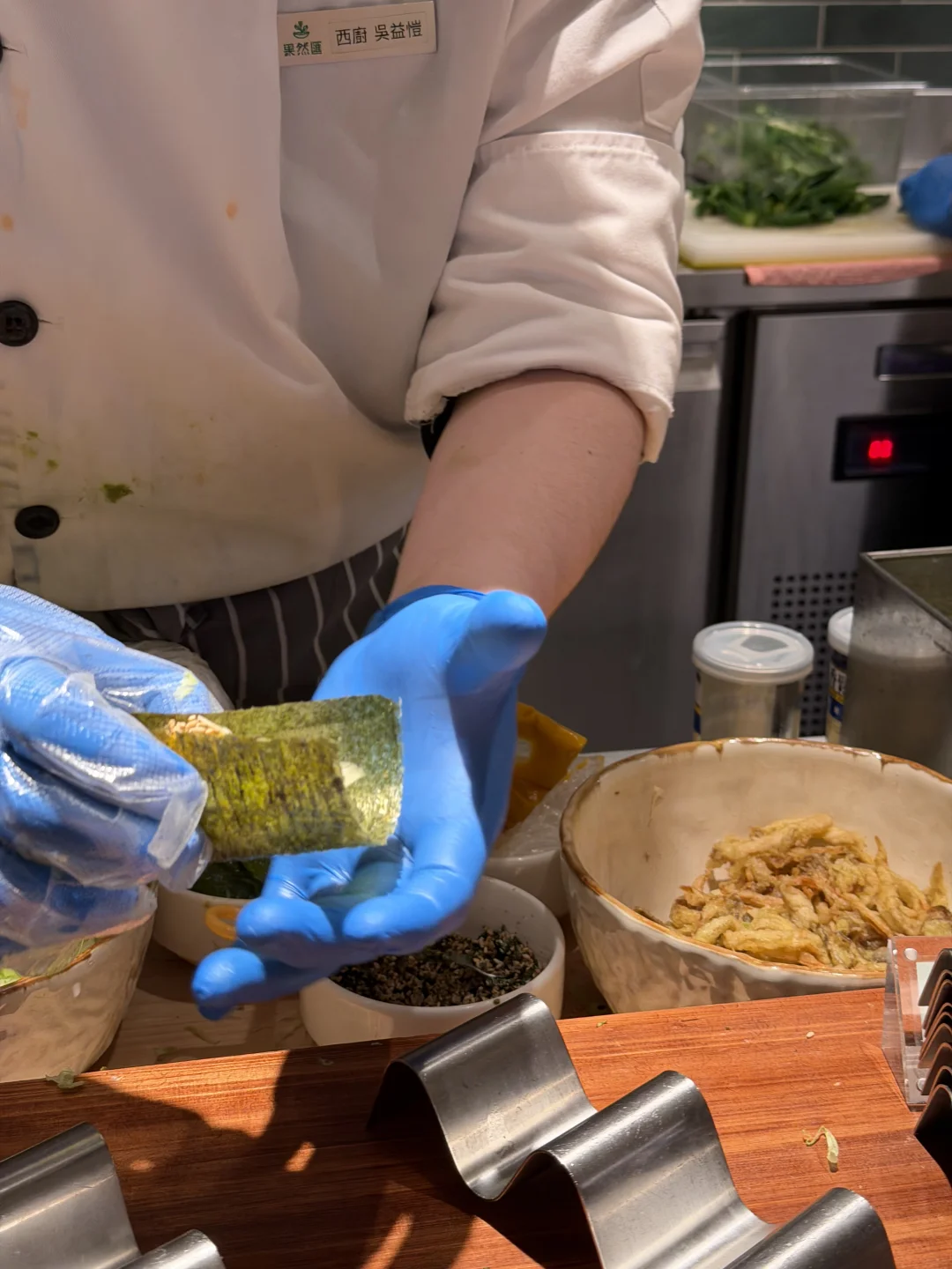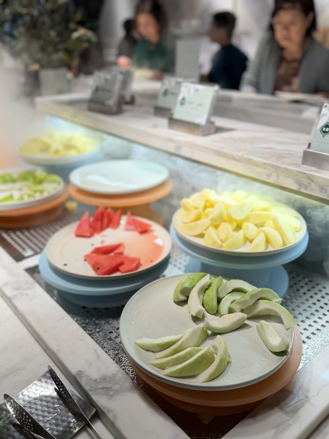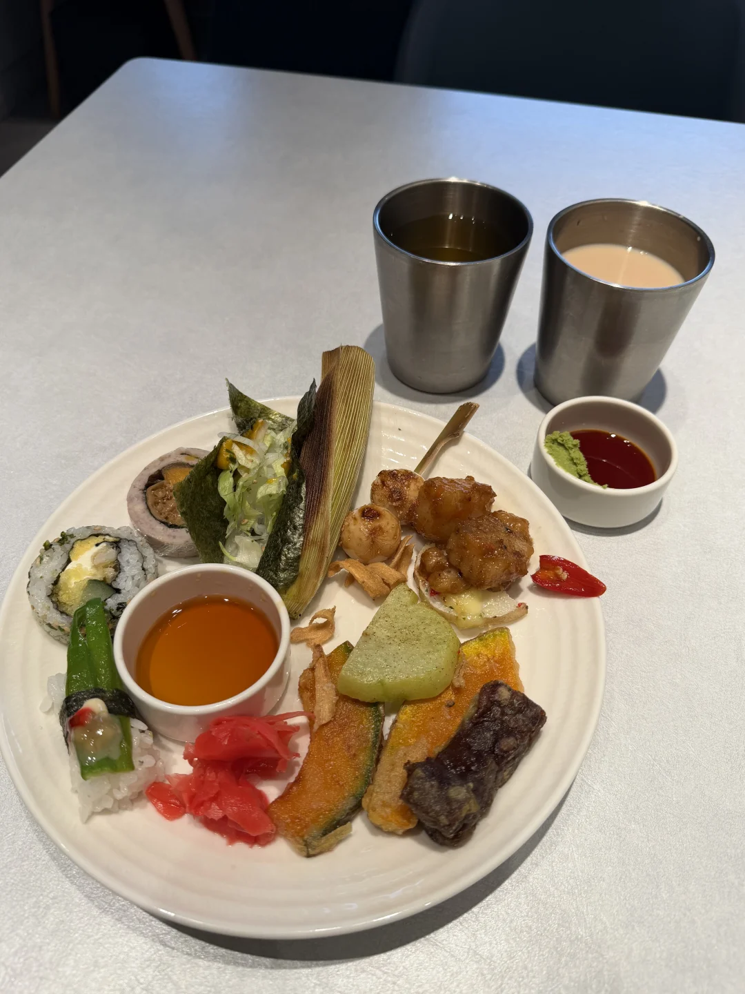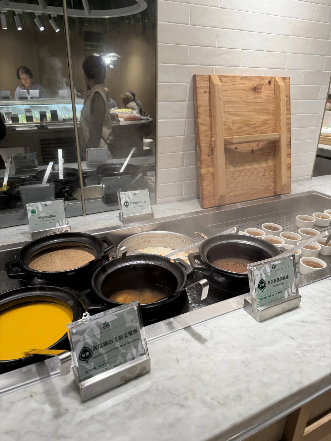 这是个周二的中午,却人巨多!很多老人!很多小孩!很多菜!一开始服务生先问我有没有来过,并带着一脸懵逼的我走了一圈取食区,还跟我说单人位置会稍远些(安静许多,我其实更喜欢),服务非常贴心。所有的食物都是素食,包括素食刺身寿司,从素食洋食舒芙蕾到中式面点,各式各样的水果和饮品,还有现点现做的小吃——没办法,只能眼大肚皮小!最令人神往的是水果区,台湾的水果真的种得棒👍这个屏东的枣子也太好吃了!