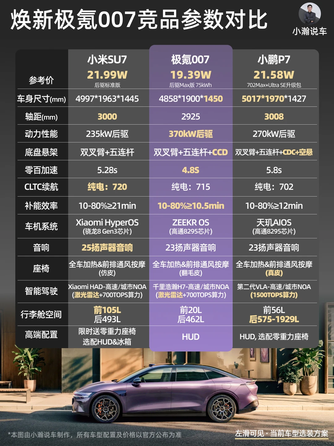 作为20万级纯电轿车里公认的配置卷王,极氪007 除了空间表现偏紧凑之外,纯电轿车核心的三电、底盘都做到了同级别出类拔萃的水准。对比同价位的小鹏P7和小米SU7,它显然是更具性价比的选择。当然,这个价位的轿车,用户决策是非常吃情绪价值的。在我看来,007的外观设计对比另外两款确实略显中庸,这也是它的销量一直没能大爆的重要原因。但只要你能接受它的外观和空间表现,极氪007在其他方面确实挑不出什么毛病。再加上极氪品牌在经历此前 “1年3改款” 引发的老车主“背刺”争议后,已经开始有意识地推出一系列举措维护老车主的感受,综合来看,这款车ju对是值得重点考虑的选项。