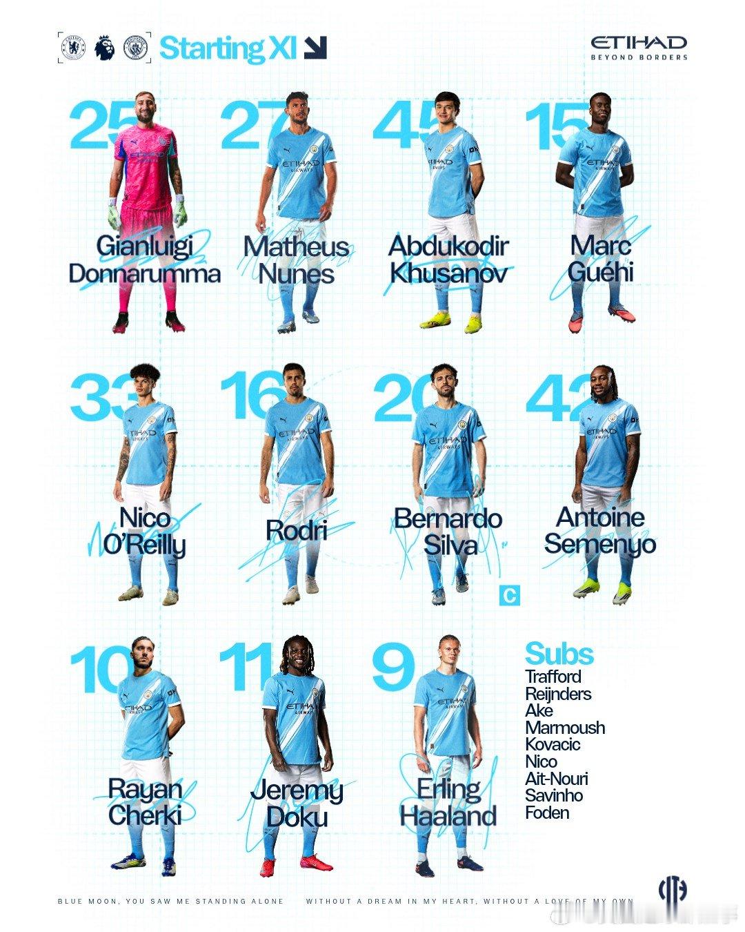曼城首发:25-多纳鲁马、27-努内斯、45-胡桑诺夫、15-格伊、33-奥赖利、16-罗德里、20-B席、42-塞梅尼奥、10-谢尔基、11-多库、9-哈兰德