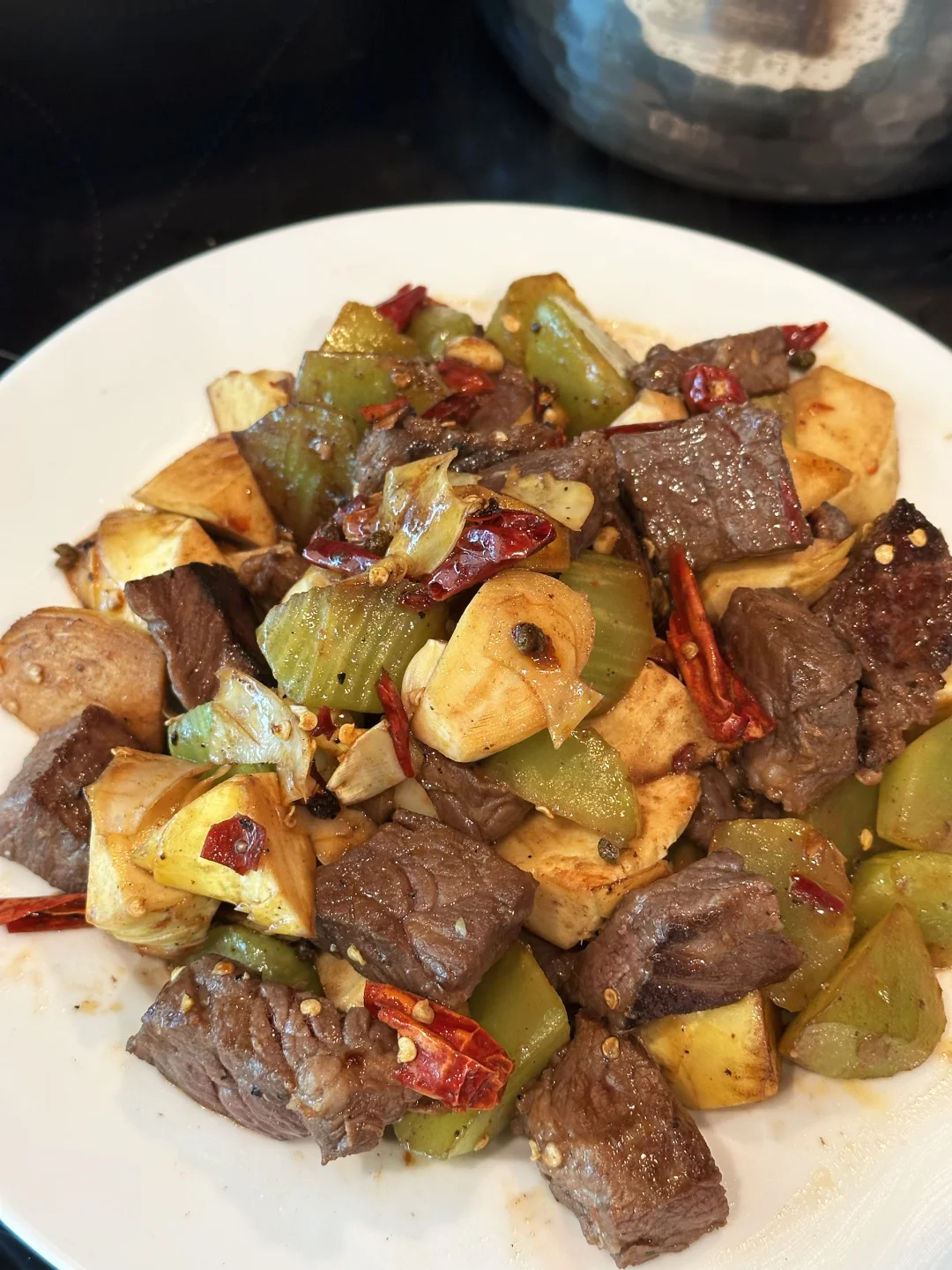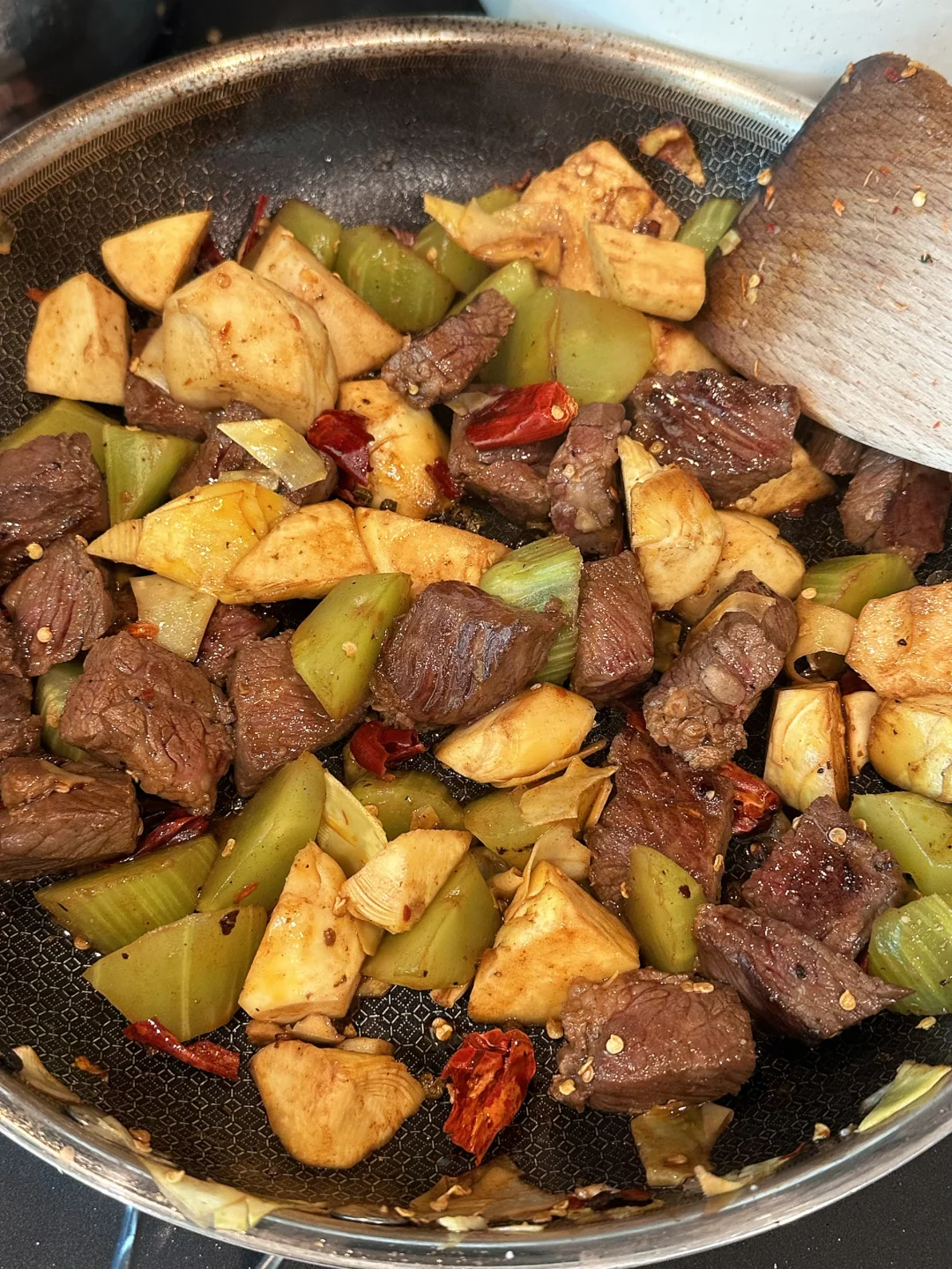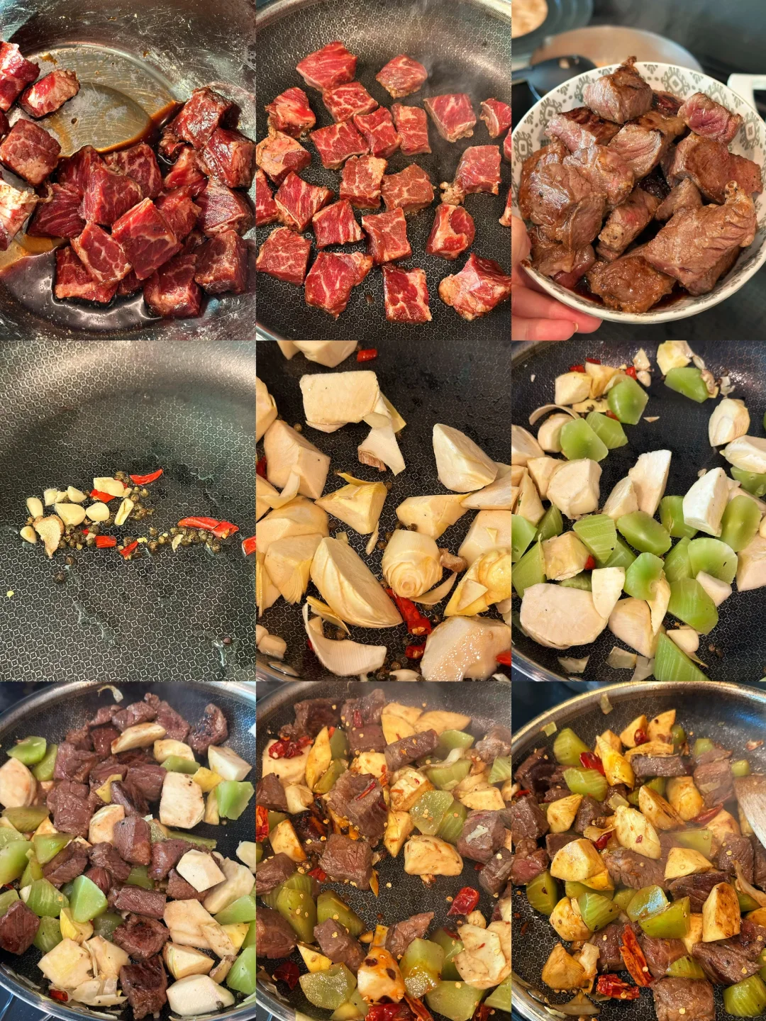 再放牛肉粒,淋生抽,米酒爆炒,再加一点蚝油和辣椒酱调味,翻炒均匀就可以出锅啦!