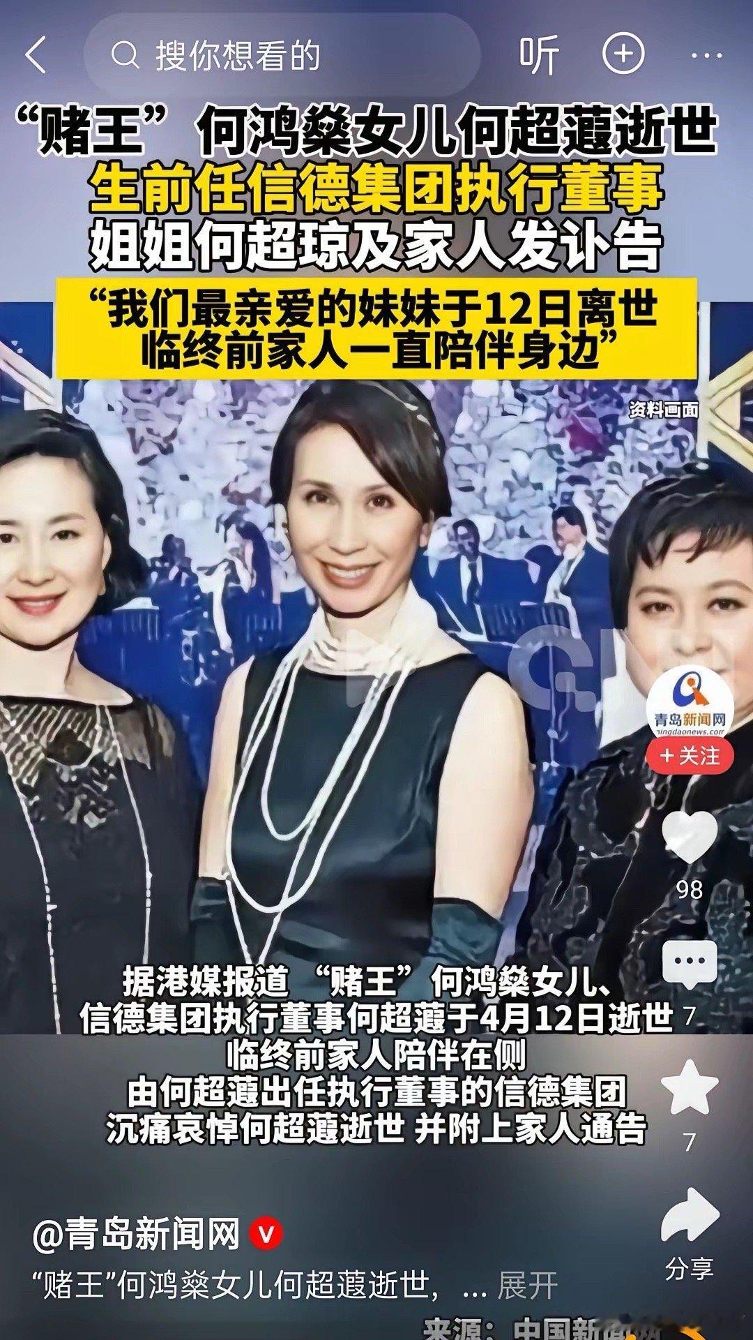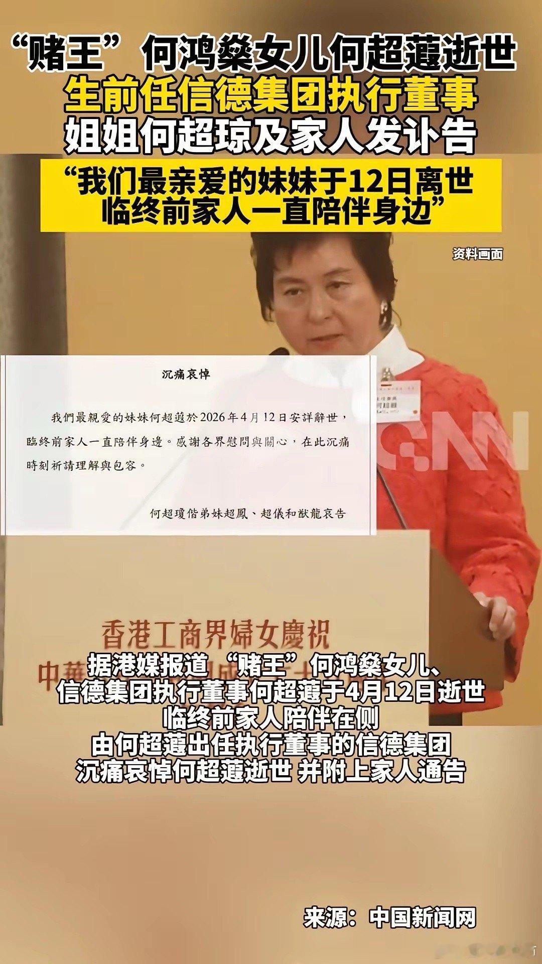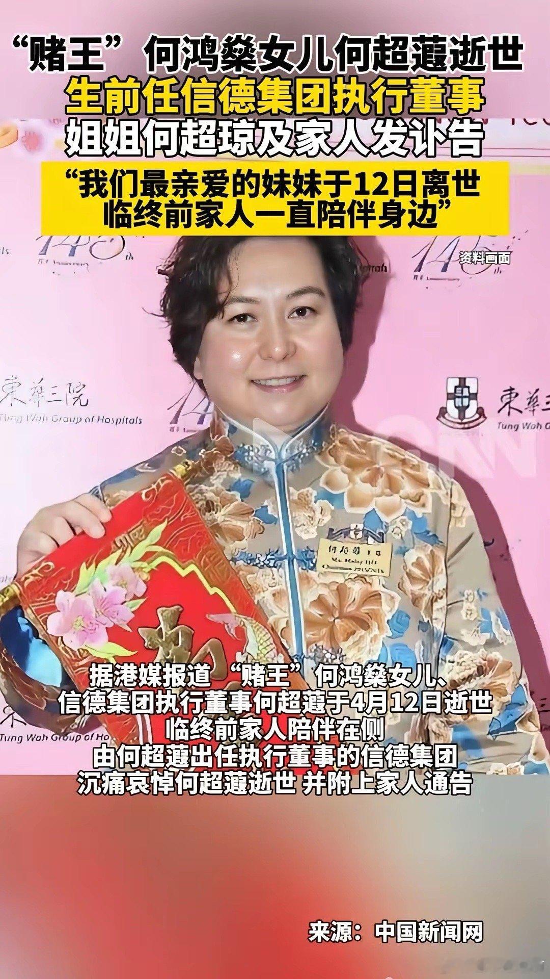 赌王的女儿这么有钱又如何?还不是60岁就病逝了。看来,在生老病死面前,即使有再多的钱,也改变不了命运的安排。2026年4月12日,一则令人唏嘘的消息传来,赌王何鸿燊的二房三女儿何超蕸,于当日安详辞世,年仅60岁。姐姐何超琼携弟妹何超凤、何超仪、何猷龙共同发布讣告,寥寥数语写尽至亲离世的悲痛,也告知世人,她走的最后一程,家人始终陪伴在侧,走得安稳平和。说起何超蕸,很多人对这个名字并不熟悉。比起在商界翻云覆雨的长姐何超琼、在娱乐圈个性张扬的妹妹何超仪,她是赌王豪门里最“低调”的千金。作为何鸿燊与二太蓝琼缨的三女儿,她生来便坐拥旁人几辈子都难以企及的财富,生前担任信德集团执行董事,深耕家族核心业务多年,是二房里默默做事的实干派。她还常年投身公益事业,在东华三院等慈善机构身兼要职,一辈子不炒作、不张扬,鲜少出现在八卦头条里,在风波不断的赌王家族,活成了一个格外安静的存在。更难得的是,在豪门数不清的家产纷争、狗血恩怨里,她始终置身事外。一生未婚,没有子女,没有纠缠不清的感情纠葛,也没有争名夺利的戏码,安安稳稳地走完了自己的一生。我们总以为,财富能摆平世间所有的难。坐拥千亿身家,就能享受全球顶级的医疗资源,就能留住健康,拉长生命的长度。可何超蕸的离开,却再一次戳破了这个执念:在生死面前,众生永远平等。任你家财万贯,任你权势滔天,也买不来起死回生的灵药,挡不住生命流逝的脚步。我们一辈子忙忙碌碌,追名逐利,总等赚够了钱、爬到了更高的位置,再好好生活,却忘了生命最珍贵的,从来都不是那些身外之物。说到底,生死有命,我们还是珍惜眼前,把握现在,享受当下吧!谁都无法预知明天和意外哪个先来,认真吃饭,好好生活,珍惜身边人,把每一天都过得尽兴,才是对生命最好的交代。