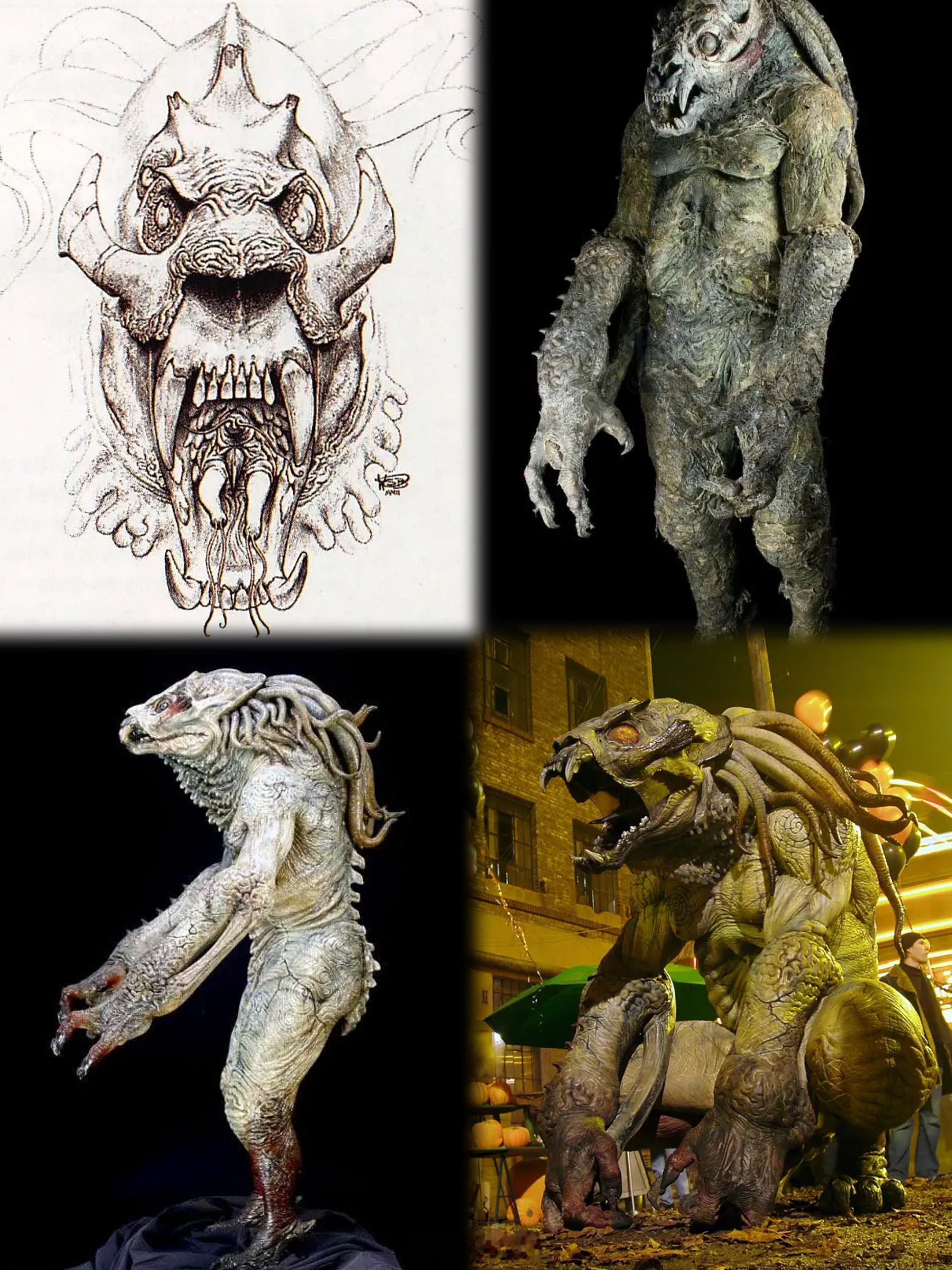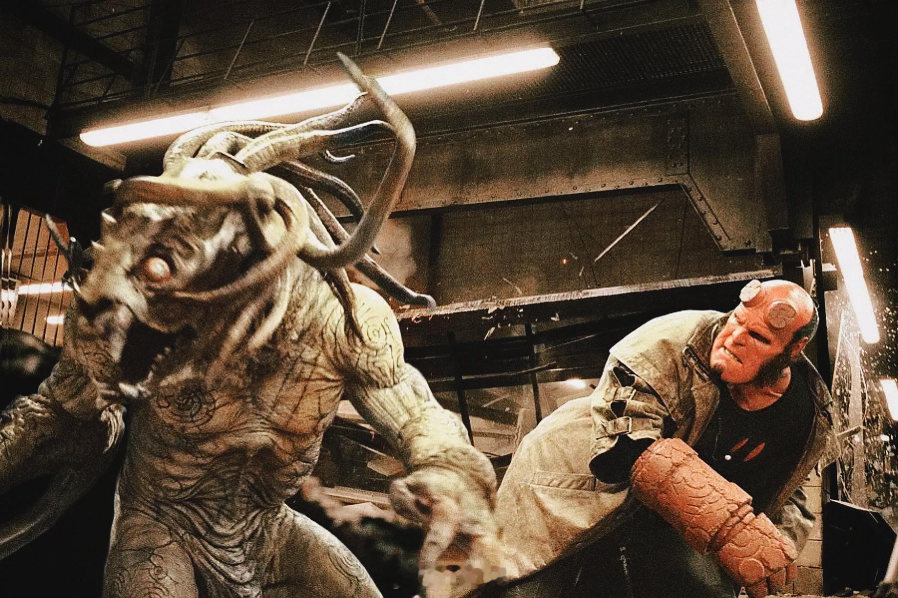 而“陀螺”导演作品的服化道,真的可以放一万颗心,他的奇幻总是那么有质感——地狱男爵的火红造型和灵动的尾巴、亚伯的行走两栖鱼人、克洛南的机械朋克+忍者感、蜥蜴+狗结合的地狱犬、触须系+庞然从云端而下的克苏鲁风邪神、利兹冰蓝色的宛若水晶质感的火焰……扮相、道具、CG和模型以及特效化妆的完美搭配,成功塑造了一个辨识度强烈、万物混杂的奇异世界,色调又冷峻又高饱和、复古阴森中透出华丽,视觉上就很有说服力。