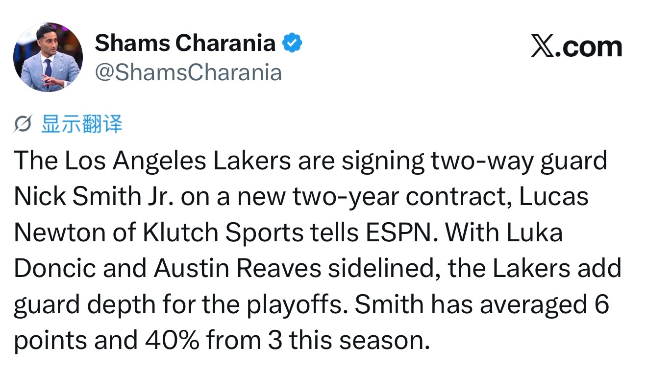 Shams:湖人签约尼克·史密斯!两年的正式合同!在东契奇和里夫斯缺阵的情况下,