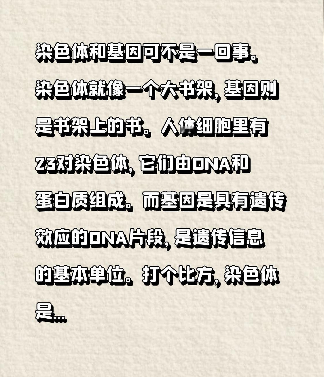 染色体和基因可不是一回事。染色体就像一个大书架,基因则是书架上的书。