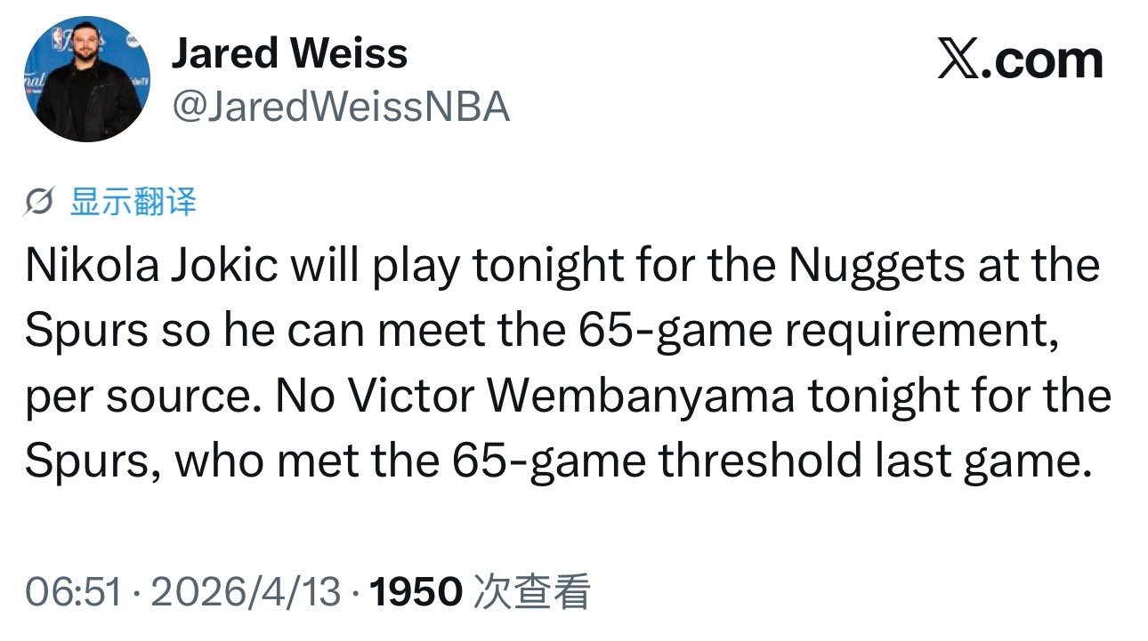 约基奇今天会出战与马刺的比赛以满足65场标准,对面文班亚马不打,他已经达标了。