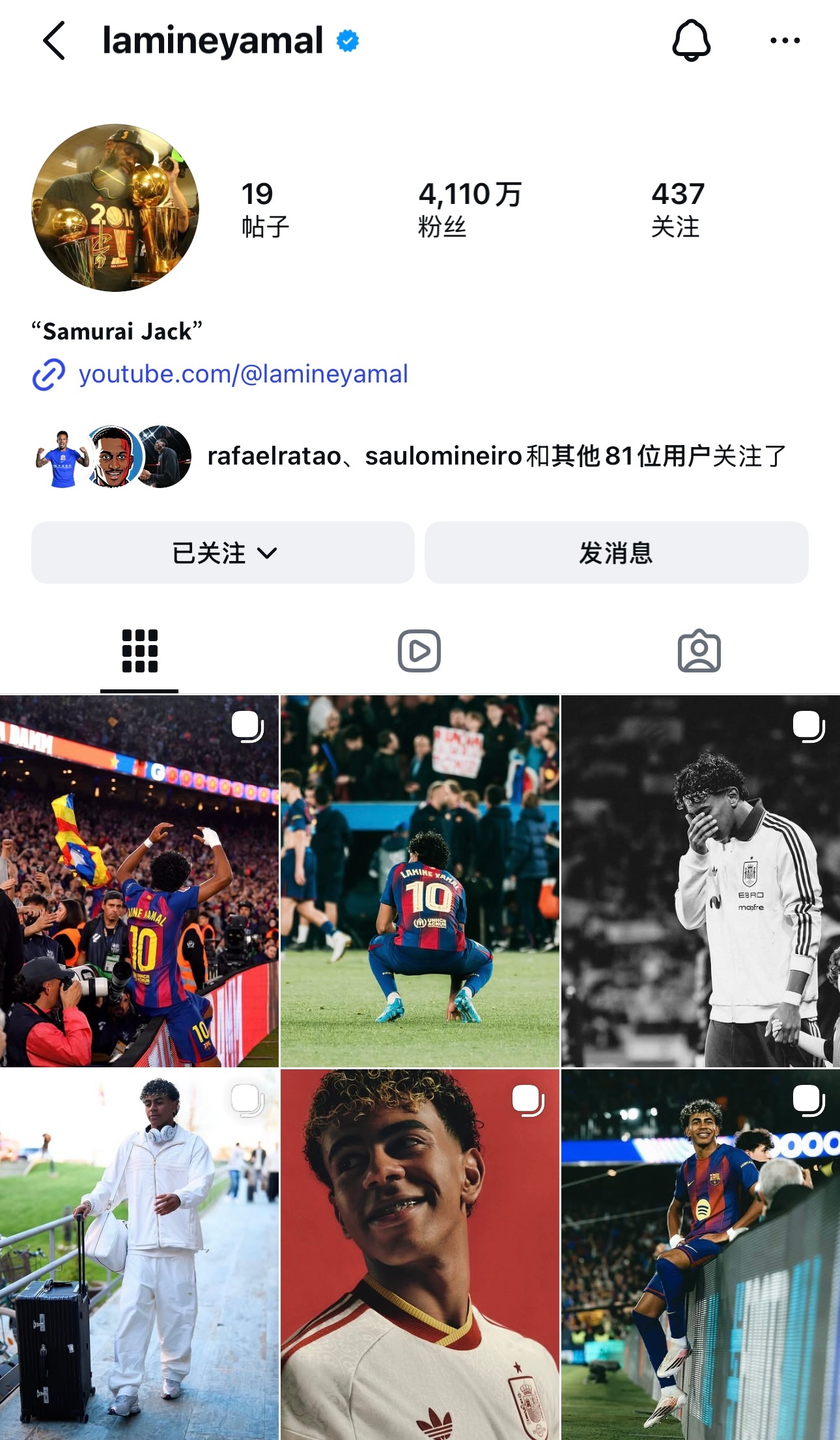 被控制了巴萨球星亚马尔近日将自己的IG头像换成了詹姆斯2016年逆转夺冠后的捧杯