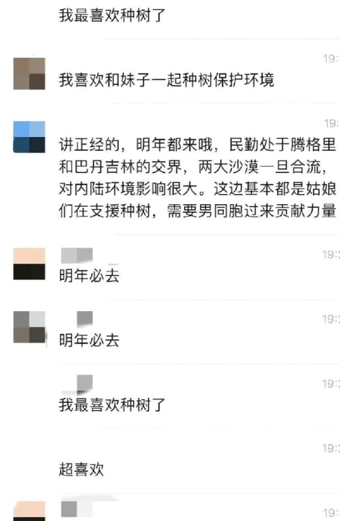 网络近日流出多张植树聊天群截图,显示多名民勤男义工调侃这场环保活动,当中有人直言「全是妹子,明年必须来」;有人将义工合照中的女生,评头品足,言词低俗;有人专门整理出所谓的「辨认女生技巧」;甚至有人表示「我全都要」、「选妃」,将热心参加植树的女义工,当作调侃取乐的对象,是践踏公众支持环保的善意。