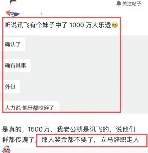 - 内部辟谣:自称讯飞的员工表示,公司内部根本没这瓜,大家还在正常买彩票。