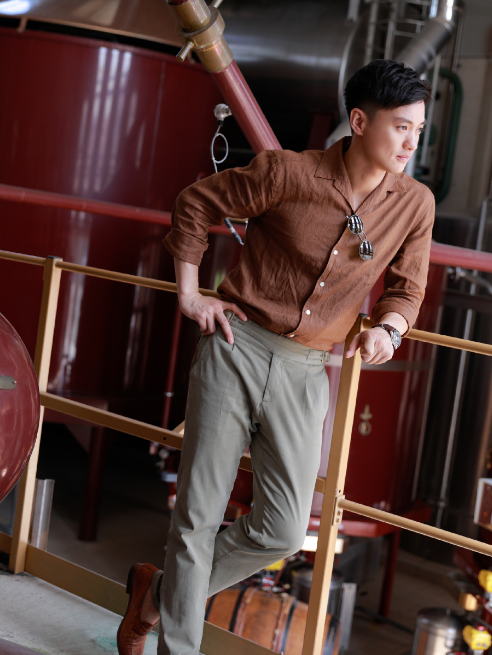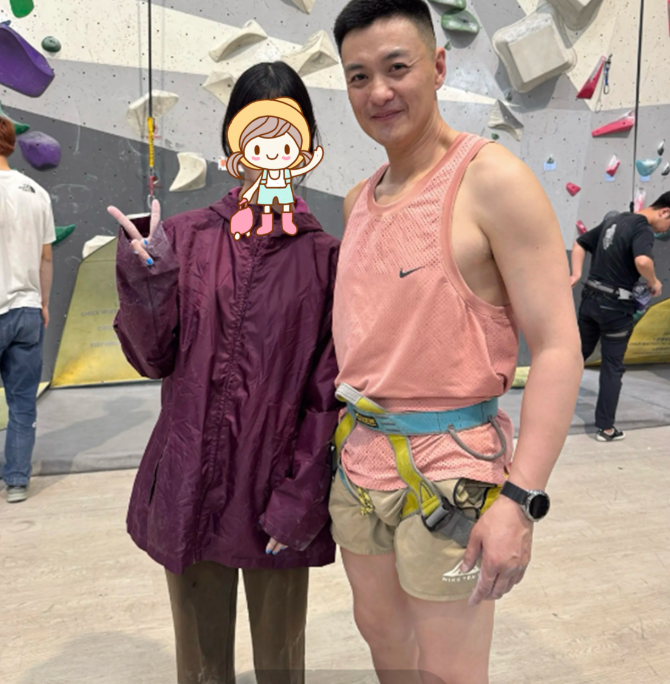 当日,周一围穿着一件粉色运动背心,搭配卡其色短裤和专业的攀岩安全带,脚上是黄黑配色的运动鞋,整体装扮非常适合室内攀岩活动。44岁的他身材健硕,肌肉线条清晰,尤其是手臂和肩部的肌肉轮廓明显,显示出长期坚持锻炼的成果。
