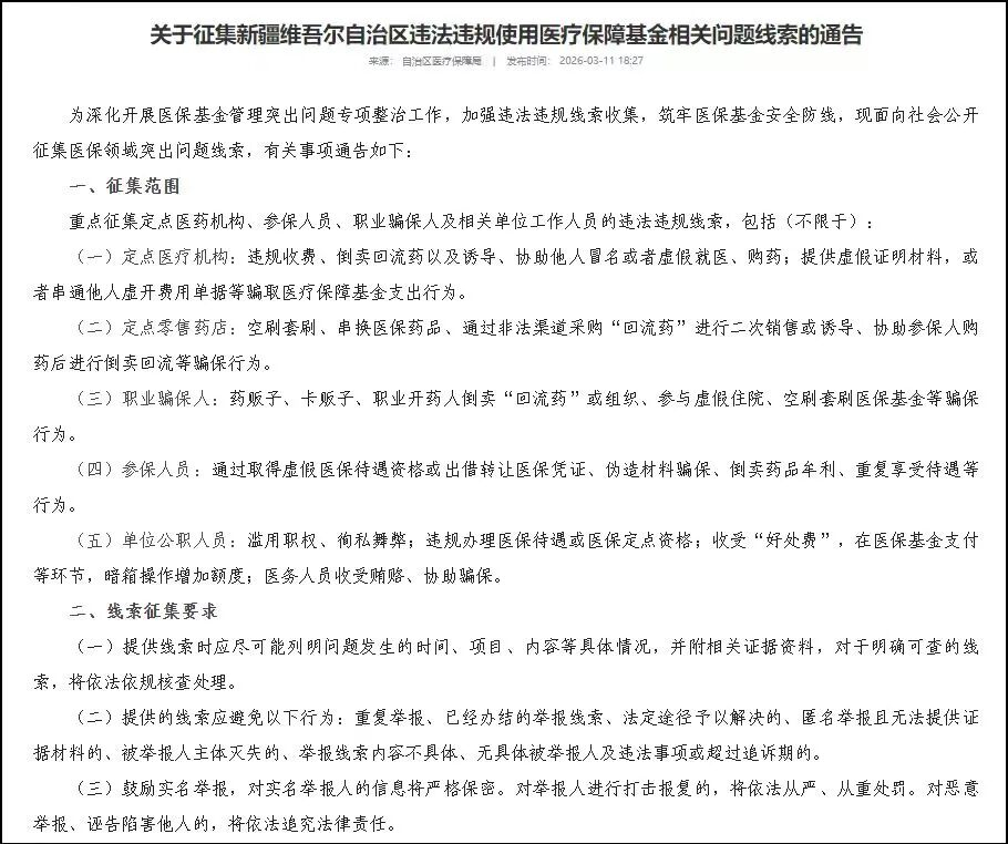 #举报医保违规最高奖20万#【各地公开征集违法违规使用医保基金线索,最高奖励20万元】#医保基金线索征集启动#近日,为深化医保基金管理突出问题整治,充分调动广大人民群众参与医保基金监管的积极性、主动性,全国各地医保部门陆续发布公告,面向全社会公开征集违法违规使用医保基金问题线索,接受群众举报监督,举报线索经查证属实,将按规定给予奖励,最高奖励20万元。