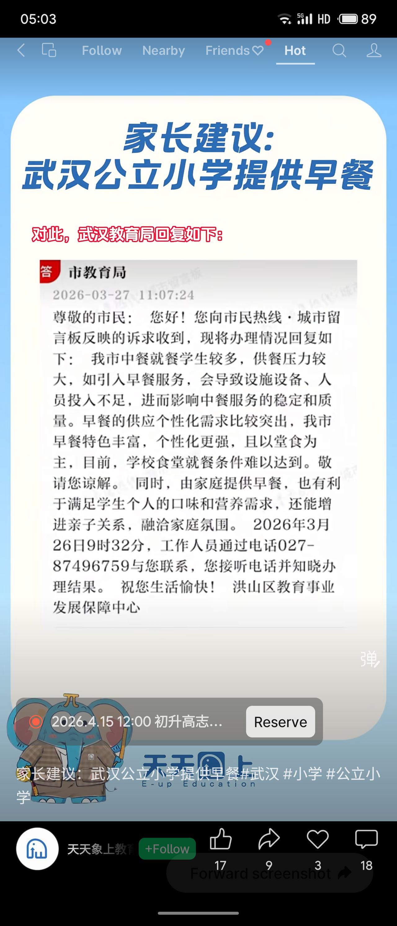 武汉一家长建议公立小学提供早餐,以减轻双职工家庭负担。市教育局回复称,中餐供餐压