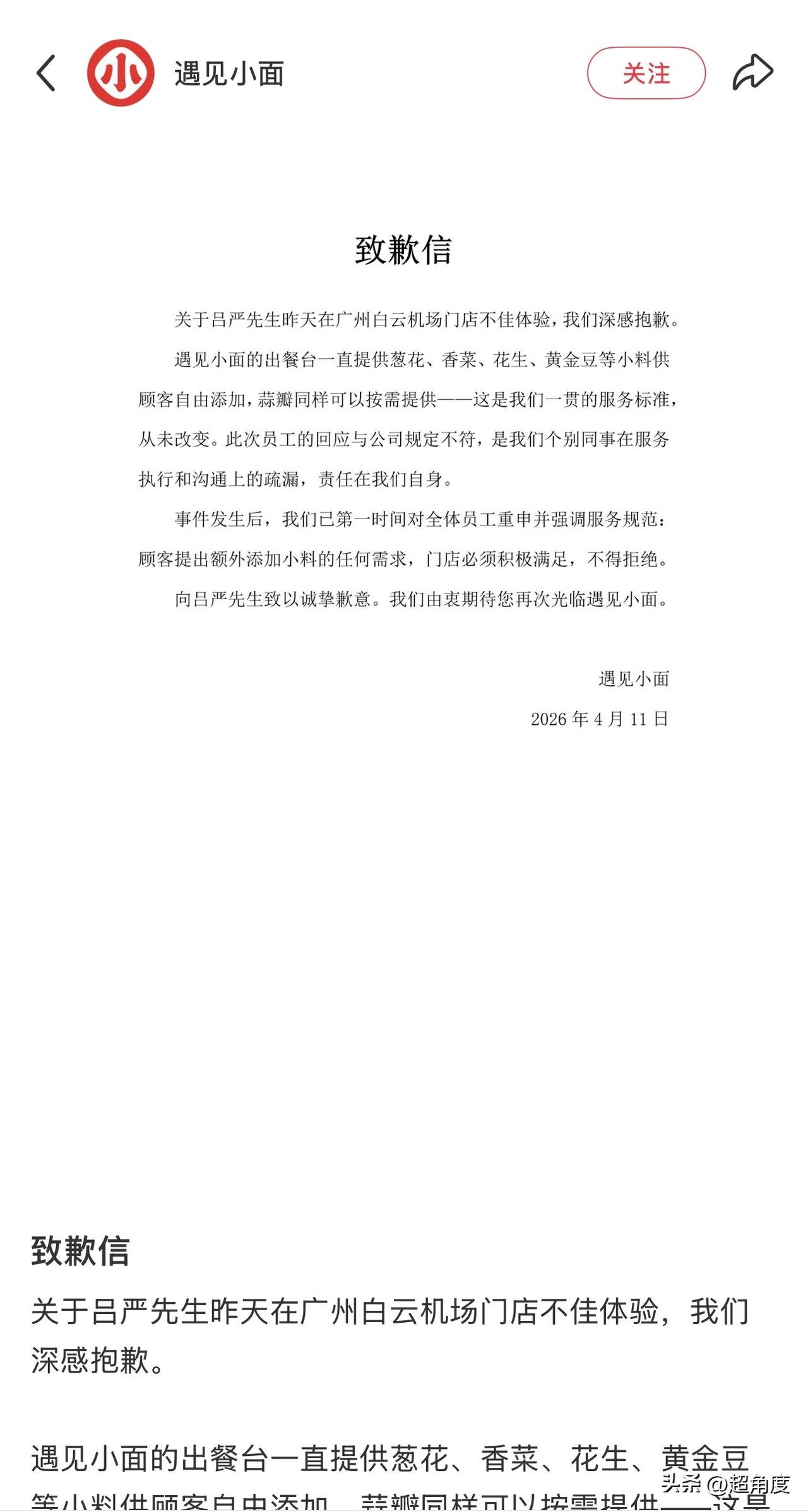 吕严在遇见小面因加葱花被店员拒绝,遇见小面发声明致歉:葱花、香菜等小料一直供顾客自行添加,个别员工执行疏漏