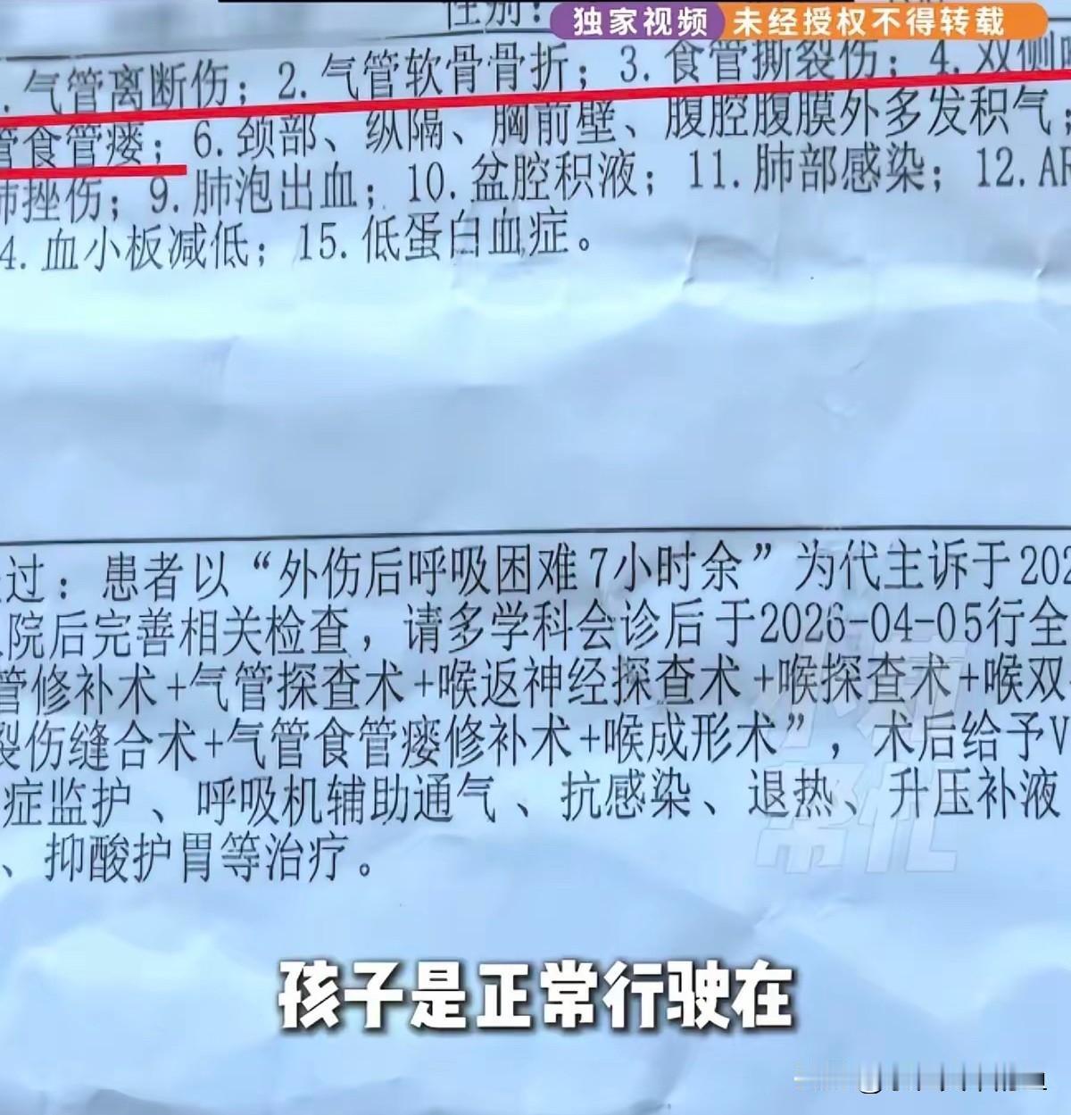 紧急送往医院后,医生的诊断书如同晴天霹雳:气管完全断裂,食管破裂,颈椎也受到了严重损伤。