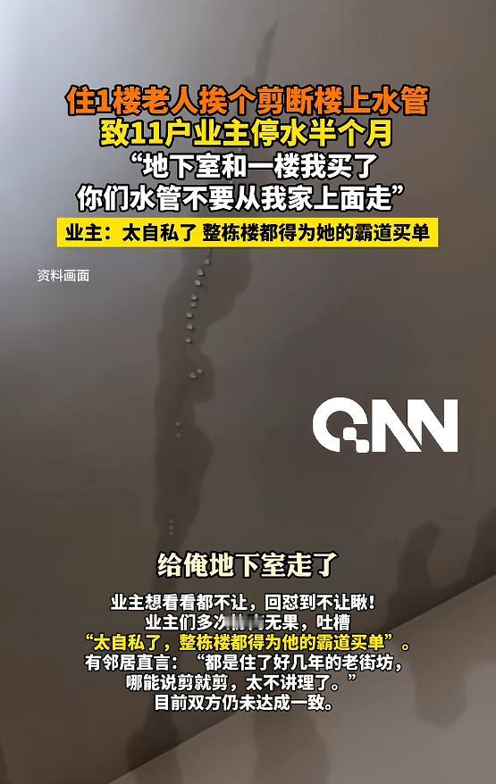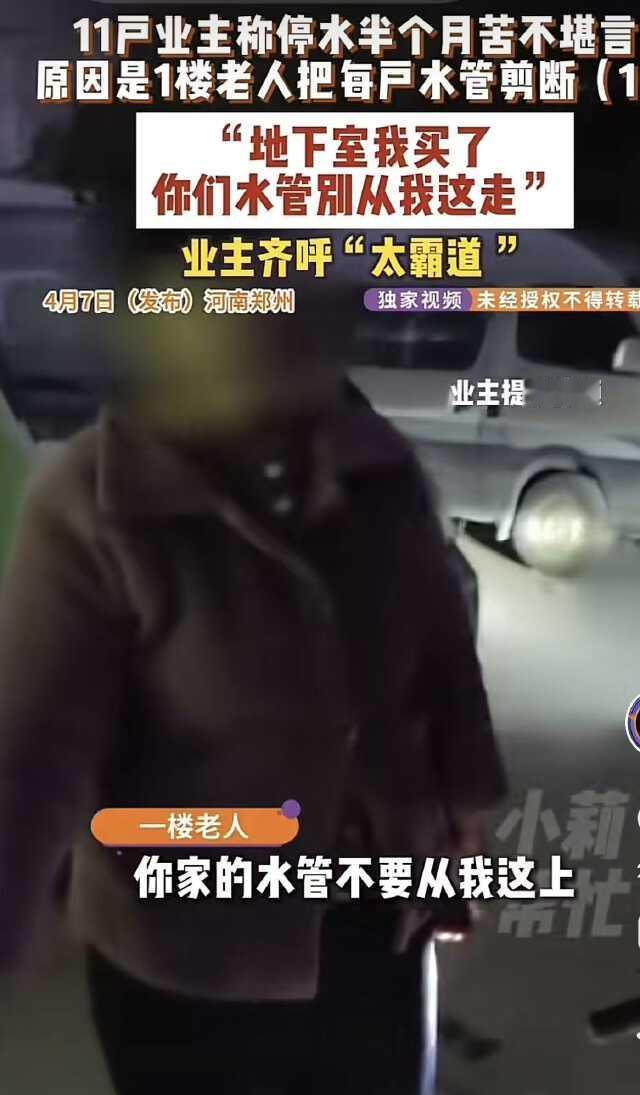 “吵翻天!”河南郑州,近日,一老人地下室老漏水,因为找不到源头,在愤怒之下,直接剪断了每户水管,导致11户业主停水15天,不仅洗不了澡,饭也不能做,面对邻居的愤怒,老人态度强硬表示:不当邻居了!这房子我奔着不要了,水管必须挪走!