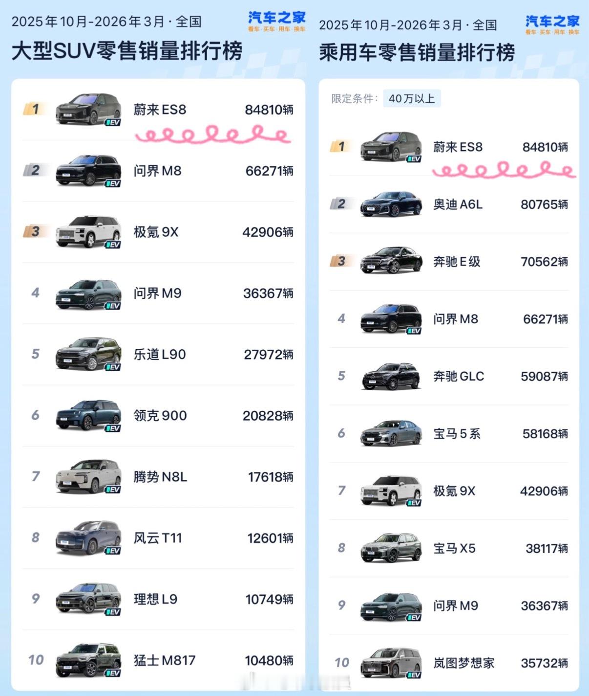 从2025年10月到2026年3月的六个完整交付月里,全新ES8累计零售销量84810辆,在大型SUV级别和40万元以上两个细分市场均排名第一。