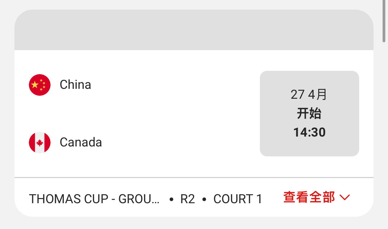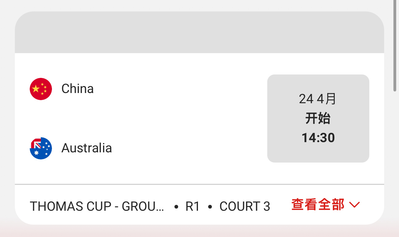 1️⃣:中国VS澳大利亚北京时间4月24日14:303号场地第1场2️⃣:中国VS加拿大北京时间4月27日14:301号场地第1场3️⃣:中国VS印度北京时间4月29日16:001号场地第1场