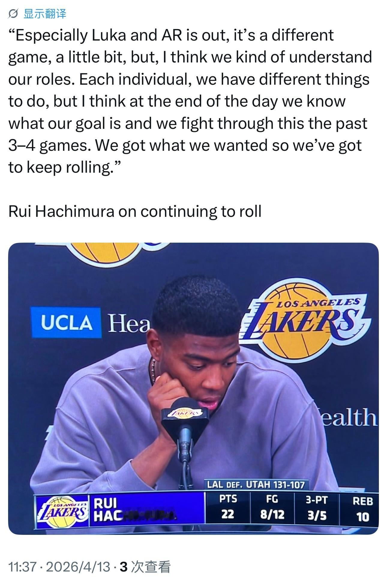 八村垒谈球队遭遇严重伤病排名西部第四的感受: