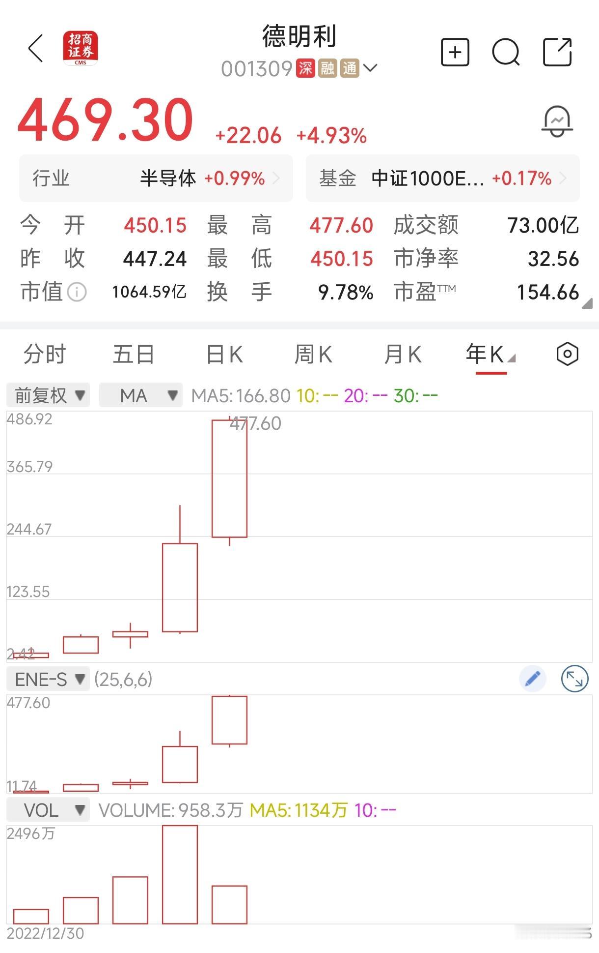 这也意味着,2022年上市的德明利公司,股价已经连续5年上涨,发行价26.54元,现价469.3元,上涨16.7倍(涨幅1670%),公司的投资人也太好运了吧!