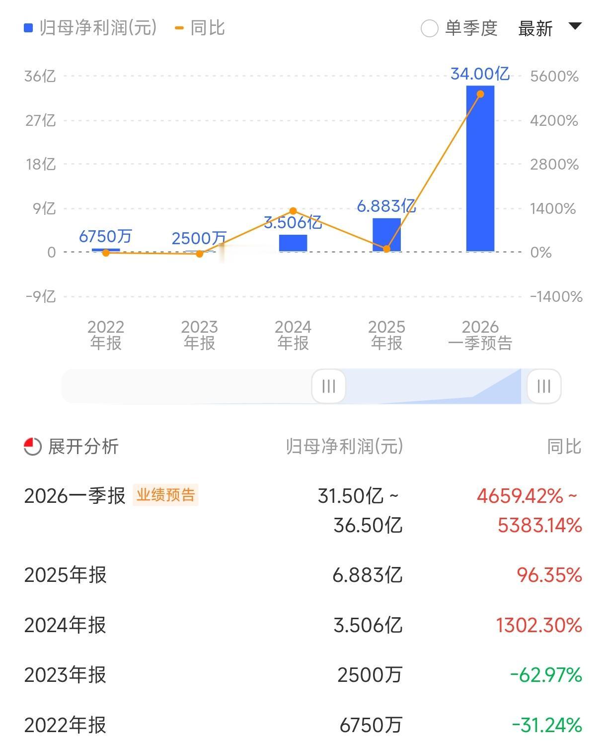 2026年一季度业绩预告:预计实现营业收入73亿元至78亿元,较上年同期增长483.05%至522.98%;归母净利润预计盈利31.5亿元至36.5亿元,上年同期亏损0.69亿元,不仅实现扭亏为盈,单季度净利润超过31.5亿元也成了A股科技公司的大明星。